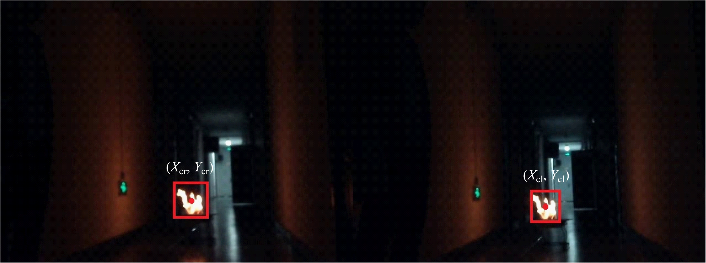 为提高双目摄像机测距范围,将双目摄像机基线设定为21 cm,图像尺寸是1 280×480。采用基于圆形度、矩形度、尖角数量特征融合的火灾监测方法,在双目摄像机采集到的左右视图中同时进行监测,监测到火焰后用矩形框标注,如图5所示,采用式(3)判断左右视图中监测到的火焰是否为同一火焰。