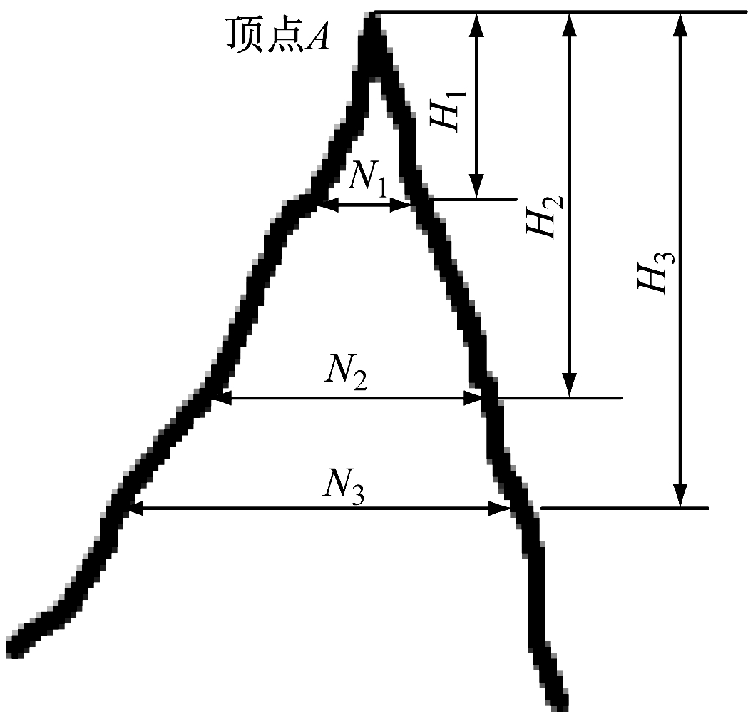 火焰形状与矿灯、车灯、巷道灯等其他发光物体相比具有明显的尖角特性,可以用来区分火焰与矿灯、车灯、巷道灯等干扰。火焰的尖角形状表现为上窄下宽。笔者提出了一种火焰尖角辨识方法,如图2所示。
