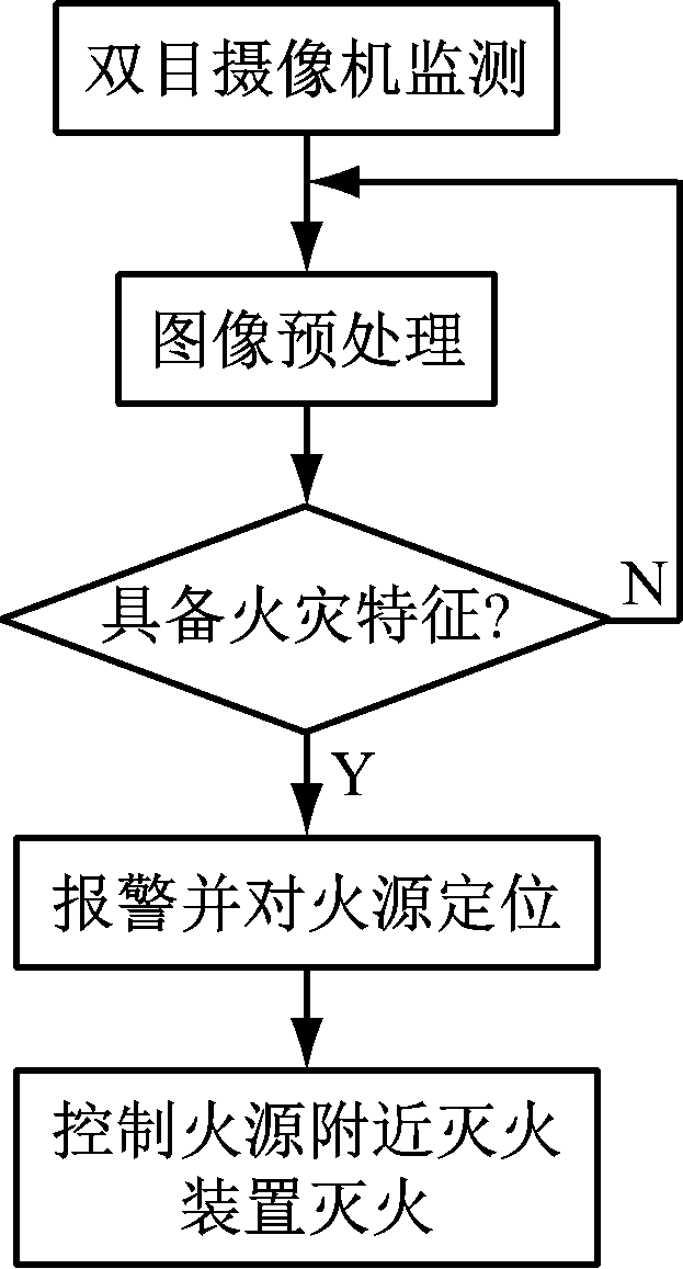 为解决矿井外因火灾感知和火源定位问题,笔者提出了基于双目视觉的矿井外因火灾感知与定位方法:① 在有电缆、胶带和机电设备的巷道、硐室和采掘工作面多点设置矿用可见光双目摄像机或近红外双目摄像机,采集监控区域图像。② 对图像进行预处理,为减少红色、橙色和黄色等物体对火灾识别的影响,采用图像亮度信息;对采集到的图像进行阈值分割得到二值化图像。③ 火焰是矿井外因火灾的主要特征,对图像进行火焰识别;若图像检测区域有火焰,发出火灾报警信号,并融合温度、烟雾、二氧化碳、一氧化碳、氧气和红外传感器信息,提高报警准确性。④ 通过矿用可见光双目摄像机或近红外双目摄像机,对火源进行测距,结合摄像机位置对火源进行定位。⑤ 输出火源位置信息,控制火源附近灭火装置灭火,也可采用远红外双目摄像机进行火灾感知和火源定位,但成本高。基于双目视觉的矿井外因火灾感知与火源定位方法流程如图1所示。