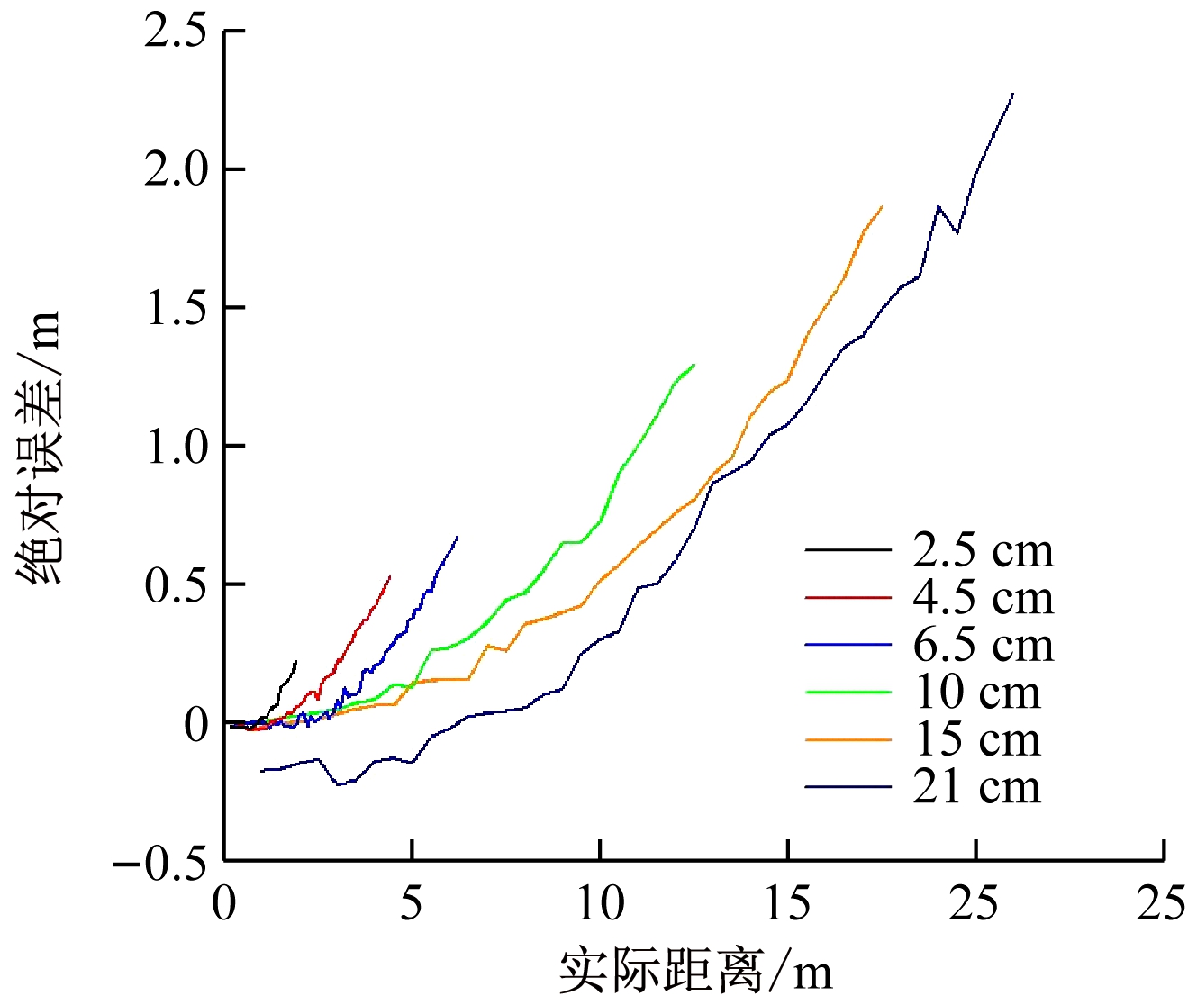 (3) 双目视觉摄像机在基线固定情况下,测距绝对误差随实际距离增大而增大,实际距离越远,绝对误差越大。在双目视觉摄像机与被测物体距离不变的条件下,双目视觉摄像机基线越大,测距绝对误差越小。双目视觉摄像机基线越大,可测最近距离越远,可测最远距离也越远。反之,双目视觉摄像机基线越小,可测最近距离越近,可测最远距离也越近。