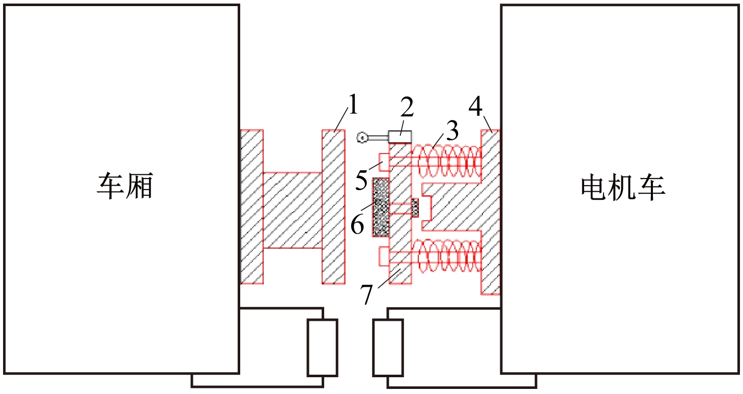 电机车与车厢挂接采用电磁铁连接方式[6]。在电机车车头一侧安装盘型电磁铁,车厢侧安装触吸板,通过电磁铁粘连触吸板实现连接,如图3所示。