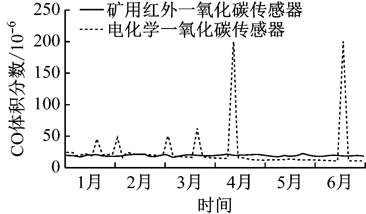 基于微型泵吸式的矿用红外一氧化碳传感器与电化学一氧化碳传感器测试数据对比如图7所示。从图7可看出:电化学一氧化碳传感器易受电磁干扰或者H2S、SO2、H2等气体干扰影响而出现不正常的高浓度值,且长时间不标校会出现灵敏度下降的现象。而基于微型泵吸式的矿用红外一氧化碳传感器稳定性好、灵敏度高、测量准确,电源工作稳定,且没有受到粉尘、电磁干扰、高瓦斯冲击及H2S、SO2、H2等有害气体的影响,基本误差均符合AQ 6205—2006《煤矿用电化学式一氧化碳传感器》的规定。实际使用中,矿用红外一氧化碳传感器的维护周期大于6个月,主要维护操作是清洁处理,无需更换敏感元件及标校。相比电化学一氧化碳传感器每15 d 周期性标校及干扰气体造成的损坏等,矿用红外一氧化碳传感器大大降低了维护人员的工作量。