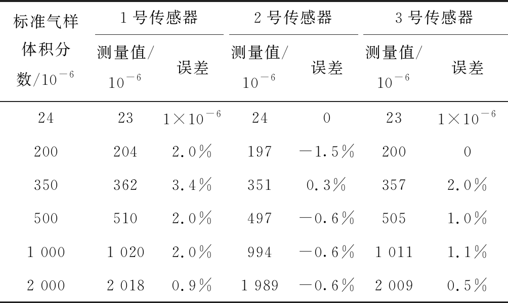 标准气样体积分数/10-61号传感器2号传感器3号传感器测量值/10-6误差 测量值/10-6误差测量值/10-6误差24231×10-6240231×10-62002042.0%197-1.5%20003503623.4%3510.3%3572.0%5005102.0%497-0.6%5051.0%1 0001 0202.0%994-0.6%1 0111.1%2 0002 0180.9%1 989-0.6%2 0090.5%