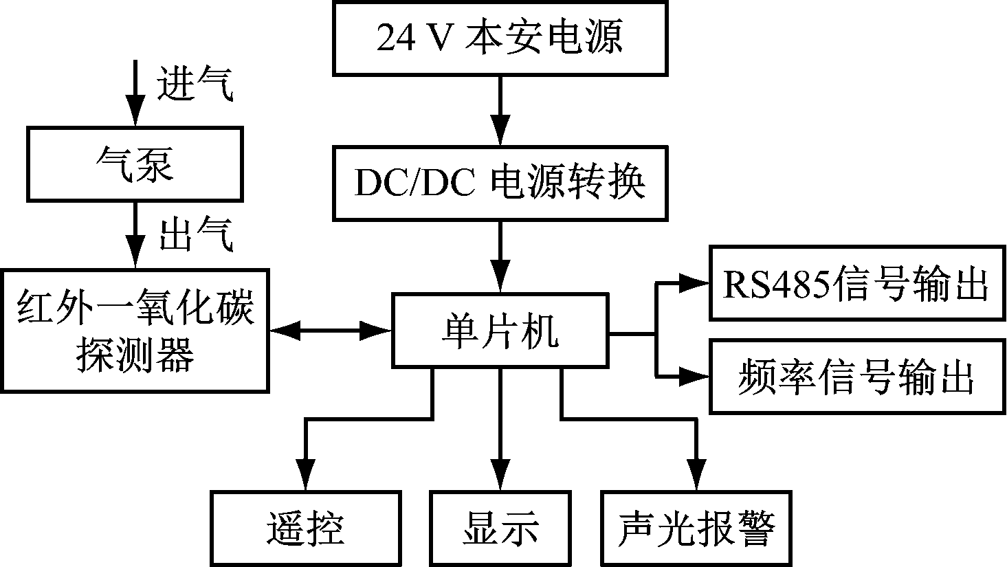 基于微型泵吸式的矿用红外一氧化碳传感器结构如图2所示。 传感器由矿用本安电源供电,经DC/DC电源转换(24 V转5 V)后给所有芯片及接口供电,待测气体由微型气泵进气口吸入后经出气口进入红外一氧化碳探测器,探测器检测到CO气体后将信号以数字方式传输给单片机,由单片机驱动数码管显示,并将CO浓度信号以RS485数字信号方式输出,且在CO浓度达到所设报警值时驱动声光报警。