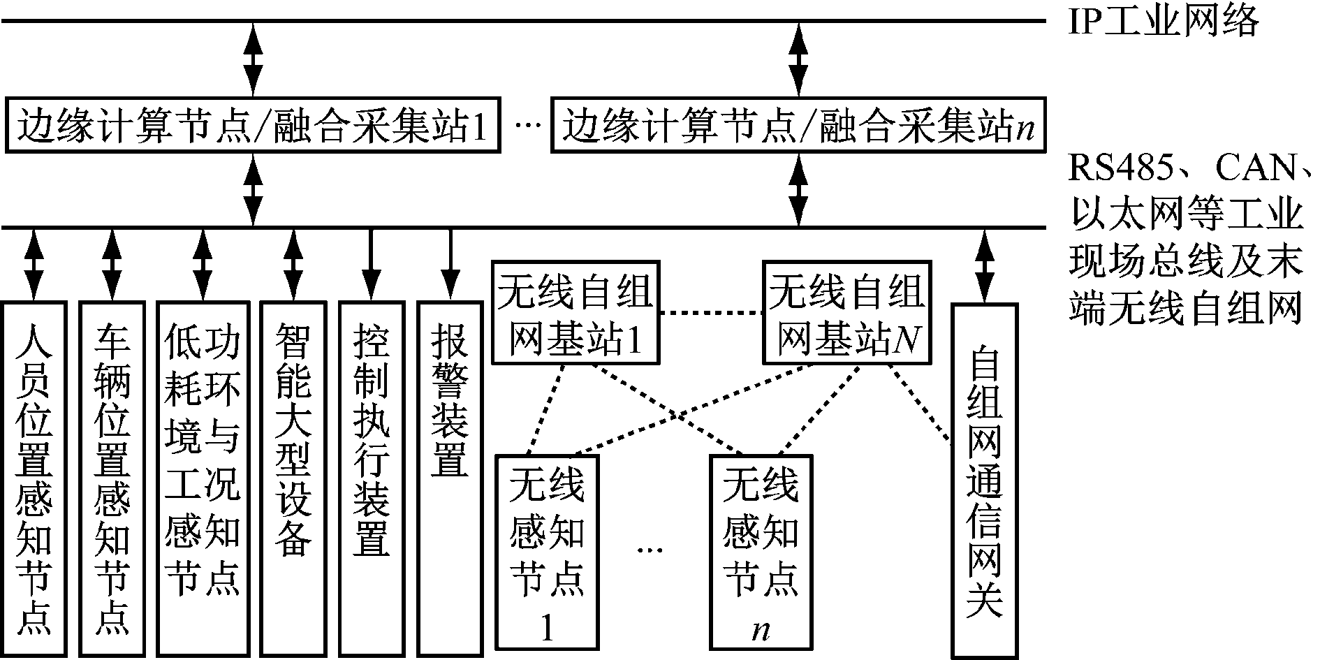 根据智能矿山感知需求,生产现场的智能端设备数量比较庞大,产生的数据也是海量级的,需要进行分级处理以保证信息处理的时效性,可根据实际情况通过高带宽无线自组网形式或有线方式接入井下作业现场边缘计算节点/融合采集站[5]。边缘计算节点/融合采集站一方面负责现场环境、工况数据的自动采集与分类,另一方面对区域范围内采集到的人、机、环等信息建立相应的信息处理模型并进行综合分析处理,进而控制现场控制执行装置的执行,形成区域范围的协同控制与联动机制。由于智能矿山整体需要基于工业物联网技术交互数据且保证数据交互协议的一致性,所以边缘计算节点/融合采集站还需要对区域范围内收集到的数据进行协议的标准化处理,再将数据以标准统一的格式传输给地面边缘计算服务节点,由地面边缘计算服务节点通过协调机制实现对井下各作业现场人、机、环等信息的协同监控与管理,形成全矿基于工业物联网的统一智能体。地面边缘计算服务节点可根据实际计算能力配置数量,由于采用了分布式数据采集与交互技术,保证了井下各系统运行的独立性。