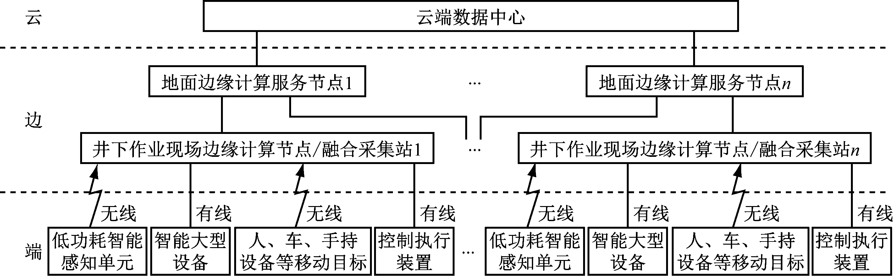 要建设智能矿山,首先要实现矿山数字化,使矿井作业现场的安全生产状况能够以数字化形式全部体现,这就需要利用工业物联网技术在煤矿作业现场及大型设备上布置大量感知装置采集现场的环境参数、移动目标位置、大型设备运行状态、各类感知对象位置信息等,并实现这些信息在矿井数据采集与处理各环节之间的传输与交互、计算,根据信息逻辑计算结果对井下设备进行相应控制执行。由于煤矿井下泛在感知产生的数据量比较庞大,对于感知设备的功耗、智能化程度,以及无线传输网络的带宽、时延提出较高要求。同时,为了保证感知信息可以实现共享,需要对感知设备进行唯一身份识别,并制定规范的数据交互协议。为了保证感知信息高效处理与实时互联,可参考工业互联网云、边、端体系架构对智能矿山数据采集流程进行规范处理[3-4],具体如图1所示。