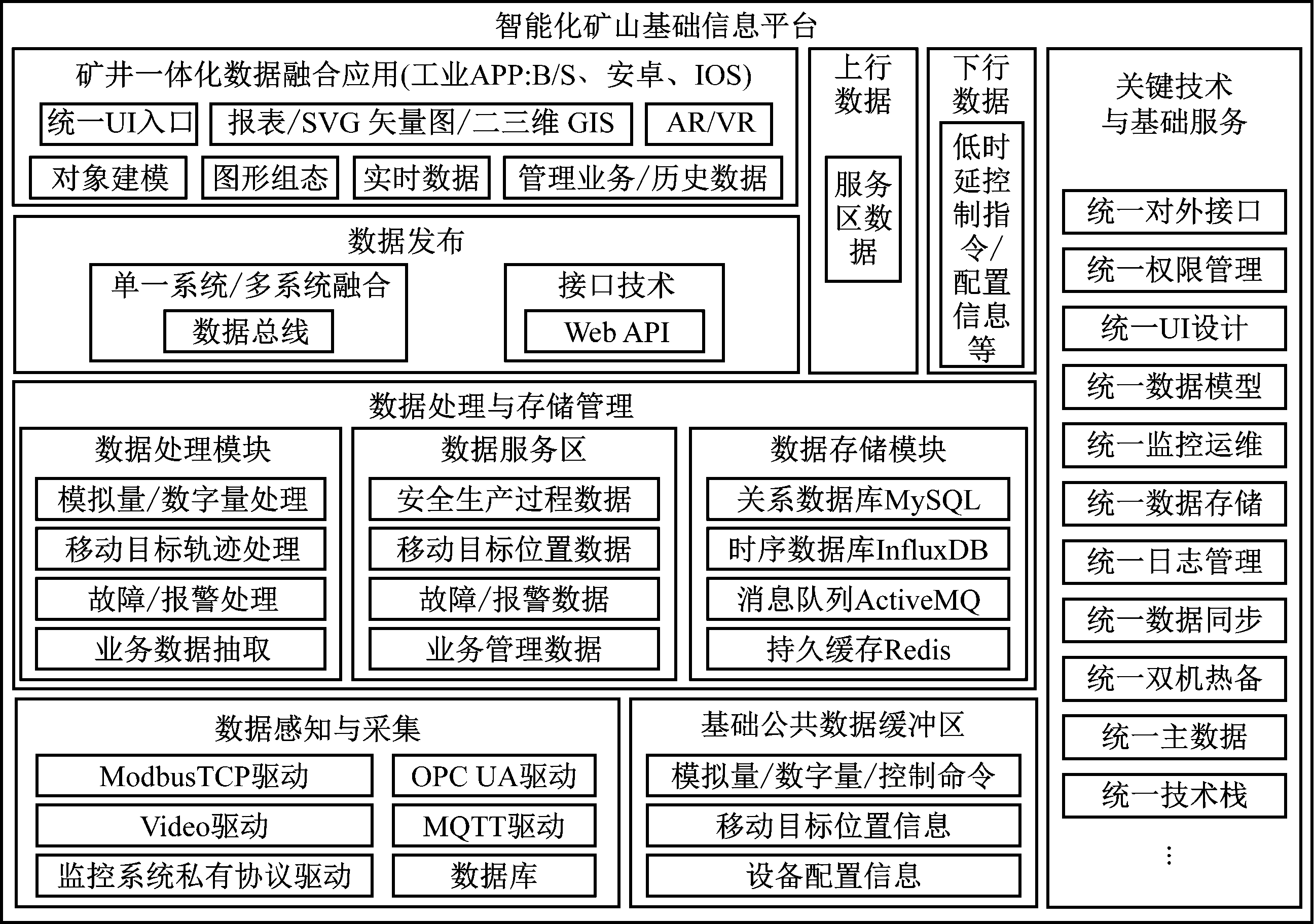 智能矿山基础信息平台设计思路:全矿井只需使用1套具有融合能力的软件平台与井下作业现场各类感知设备、智能装备、控制执行装置和边缘计算设备进行通信与数据交互,突破原有各自动化系统均建立1套监控软件的限制,实现真正意义上的煤矿井下人、机、环一体化监测监控。