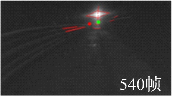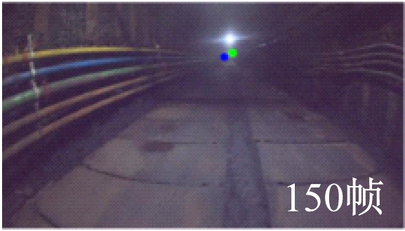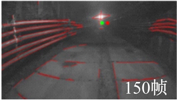 从图6可看出,在第150帧时,光照条件正常,图像中能够检测到的直线多,3种方法得到的灭点均比较接近真实灭点;在第540帧时,光照条件差,图像中的直线特征不明显,3种方法得到的灭点与真实灭点相比均出现了明显差距,但本文方法得到的灭点更接近真实灭点;在第560帧时,图像上方出现了强光干扰,与基于边缘和基于深度学习的灭点检测方法相比,本文方法得到的灭点更接近真实灭点。由此可知,本文方法对光照变化有较强的鲁棒性,更适用于矿井巷道复杂场景的灭点检测任务。