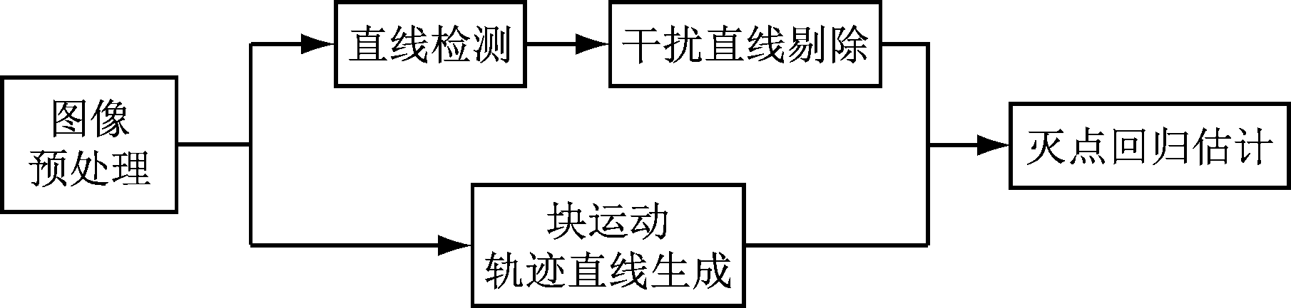 矿井巷道复杂场景灭点检测方法流程如图1所示。首先对原图像进行等比例缩小至1/2、灰度化、滤波等预处理,以大幅减少计算量,较好地保留直线特征;然后检测直线并剔除干扰直线,同时利用块匹配算法生成块运动轨迹直线;最后,采用改进的加权回归算法完成灭点回归估计。