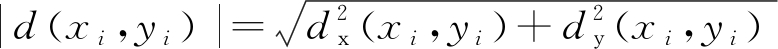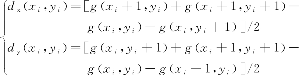 (2) 假设直线为水平分布,首先根据直线方程计算f(xstart),对f(xstart)取整数,则直线上第1个像素点的邻域像素点坐标为(xstart,f(xstart)+1),(xstart,f(xstart)-1)。以此类推,将直线上所有像素点和其邻域像素点组成一个点集{(xi,yi)},i=1,2,…,n,n为像素点数量。假设点集中第i个像素点灰度值为g(xi,yi),则水平方向梯度dx(xi,yi)和垂直方向梯度dy(xi,yi)分别为