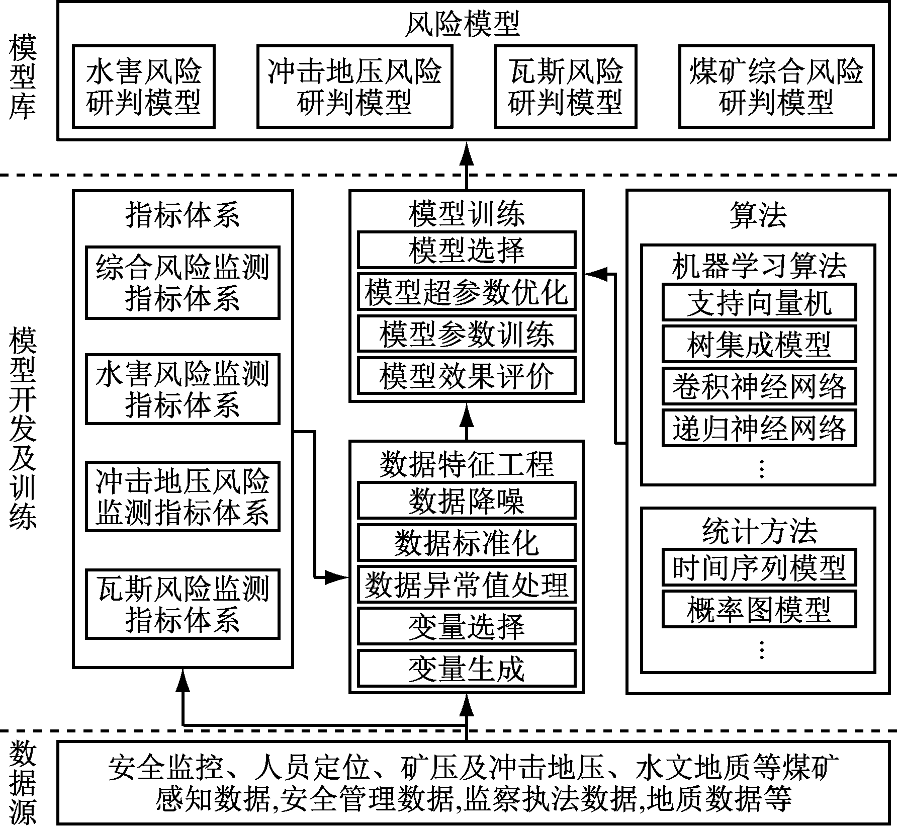 (4) 基于大数据的煤矿灾害风险模型构建技术。基于煤矿井下人员信息、设备及环境感知数据、安全管理数据等,结合专家经验,基于人、机、环、管等因素构建瓦斯、冲击地压、水害等风险指标体系,应用机器学习算法和统计方法构建灾害风险模型。通过数据特征工程进行数据预处理,包括数据降噪、数据标准化、数据异常值处理、变量选择和变量生成。利用数据资源池的样本数据进行灾害模型训练,包括模型选择、模型超参数优化、模型参数训练和模型效果评价,进而形成灾害风险模型库,进行实际应用,并根据应用效果修正指标体系和灾害风险模型,形成闭环管理,如图3所示。