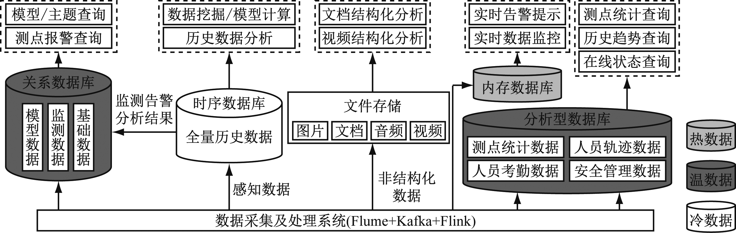 (4) 数据开发。根据汇聚数据的资源类型和数据采集频率不同,实时数据采用Flink进行在线流式计算,数据仓库各分层之间的离线数据采用Spark进行计算;针对热、温、冷数据,分别采用内存数据库、分析型数据库和时序数据库进行存储。