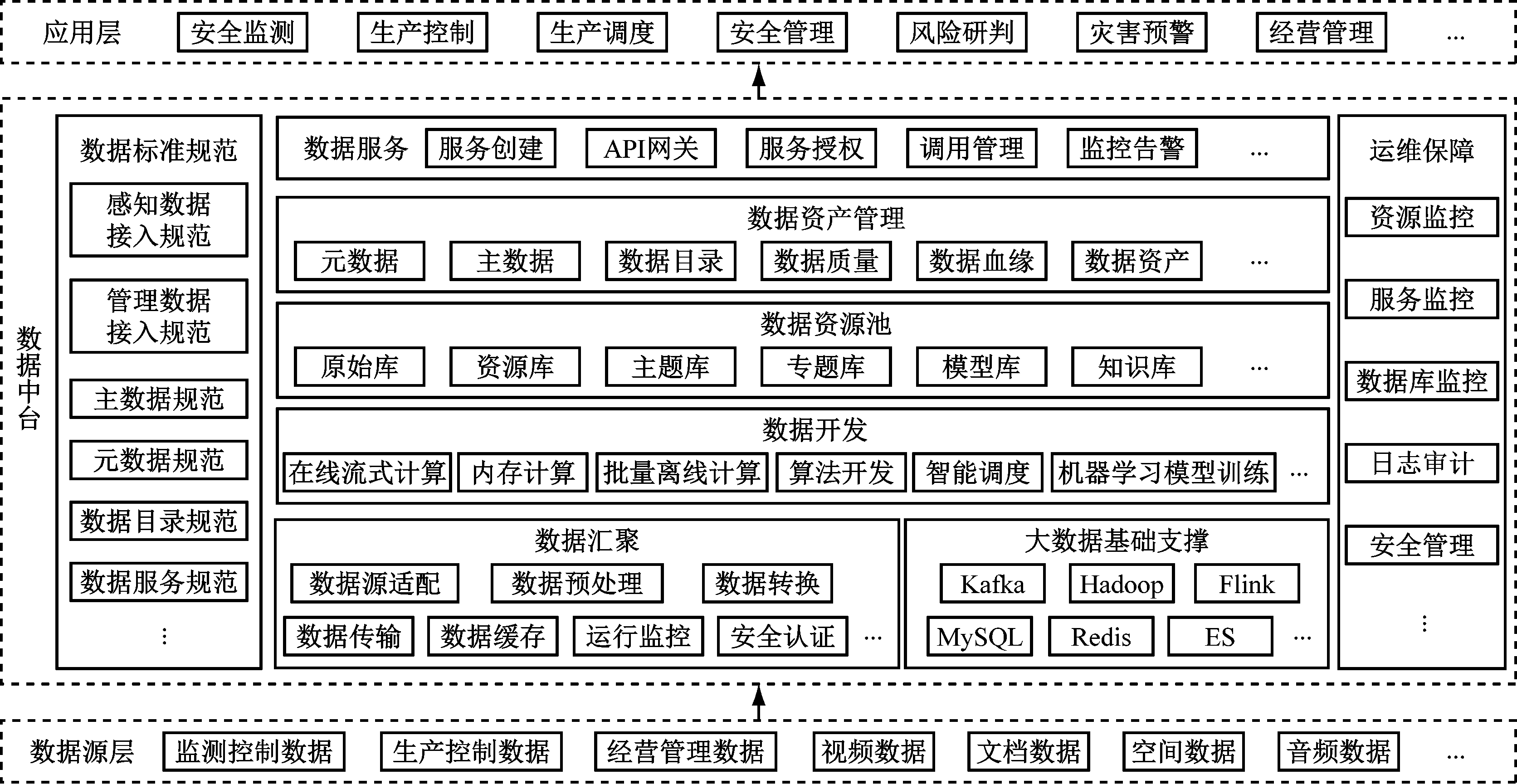 智能煤矿数据中台的主要功能是沉淀数据资产和构建分析模型,通过数据汇聚、数据治理、One ID、One Model、One Service来实现整体的数据加工、沉淀及服务,提供指标数据、标签数据、算法服务。智能煤矿数据中台主要包括数据标准规范、大数据基础支撑、数据汇聚、数据开发、数据资源池、数据资产管理、数据服务和运维保障等功能模块,通过统一的平台打通数据源层各系统之间的数据流,汇聚数据至统一的数据资源池进行存储、治理、分析,并通过数据服务为应用层提供数据,如图1所示。