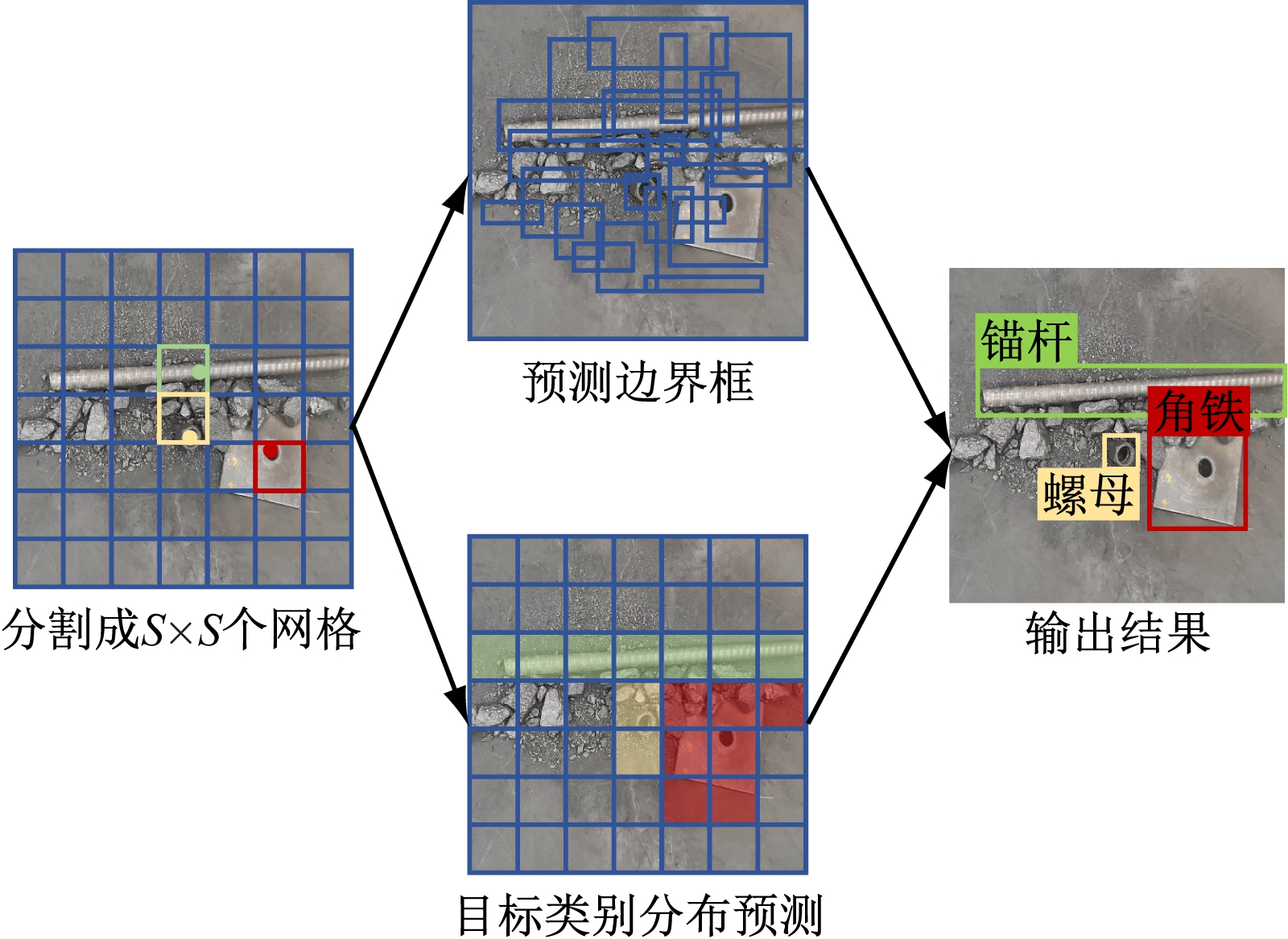 YOLOv3算法是一种基于回归的预测方法[14-15],其预测过程如图2所示。算法将输入图像分割成S×S个网格,预测目标的中心落在某个网格中,则由该网格负责预测该目标。利用卷积神经网络直接回归预测目标的相对位置与类别,构建预测边界框。通过置信度阈值和非极大值抑制算法对所有边界框进行筛选,将置信度最高的边界框作为输出结果。