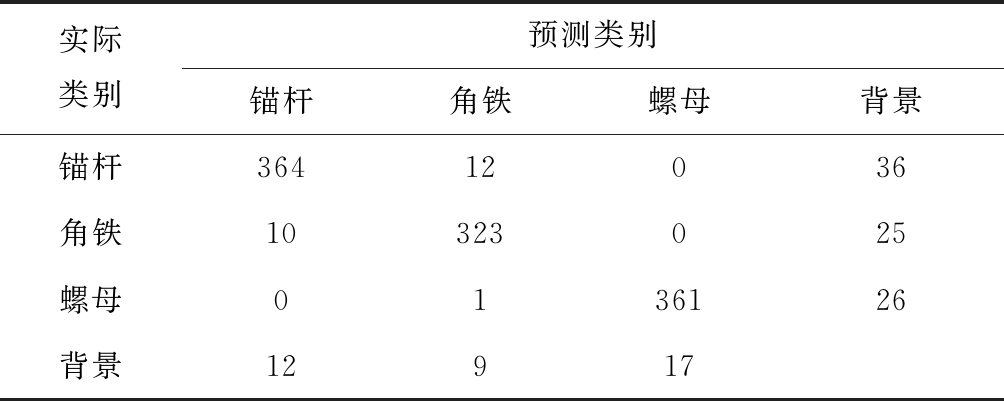 从表4可看出,第1折共出现1 178个异物样本,其中锚杆出现412次,角铁出现358次,螺母出现388次。经计算可得:3种异物的预测精确率分别为88.3%,90.2%和93.0%,召回率分别为94.3%,93.6%和95.5%,F-1得分分别为91.2%,91.9%和94.2%,平均准确率为90.5%。