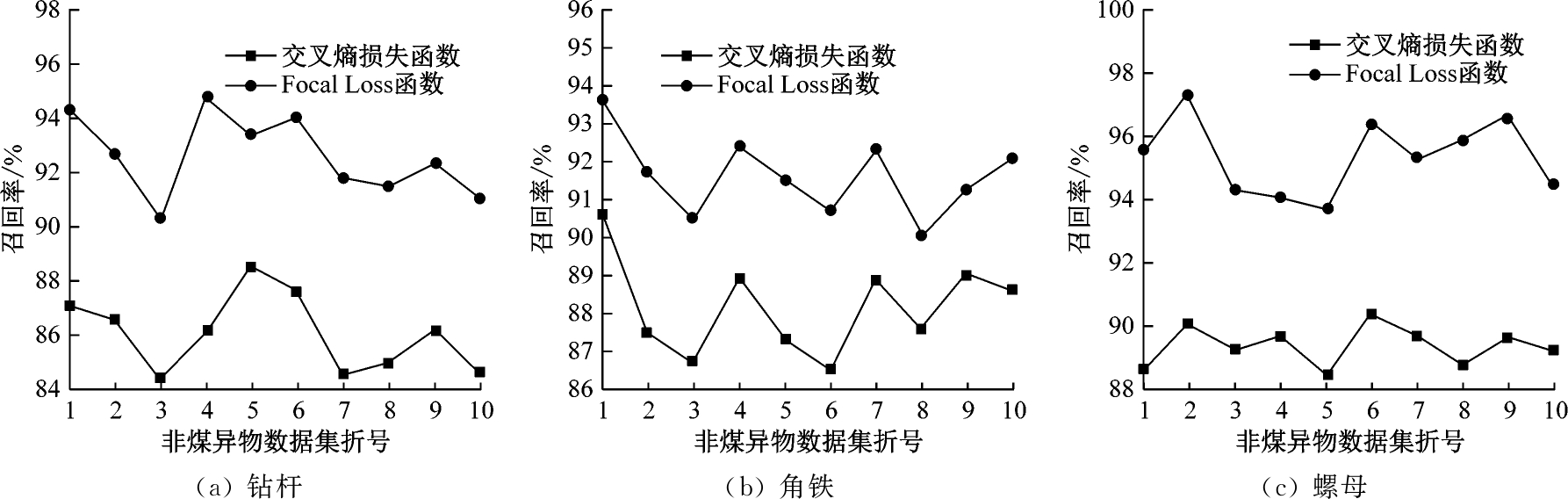 用10-折交叉验证对YOLOv3模型改进前后的异物检测精确率和召回率进行统计,结果如图8、图9所示。可看出利用Focal Loss函数改进模型后,精确率和召回率明显提升。经计算,锚杆、角铁、螺母的平均精确率分别提升了约4.7%,3.5%和6.8%,平均召回率分别提升了约6.6%,3.5%和6.0%。