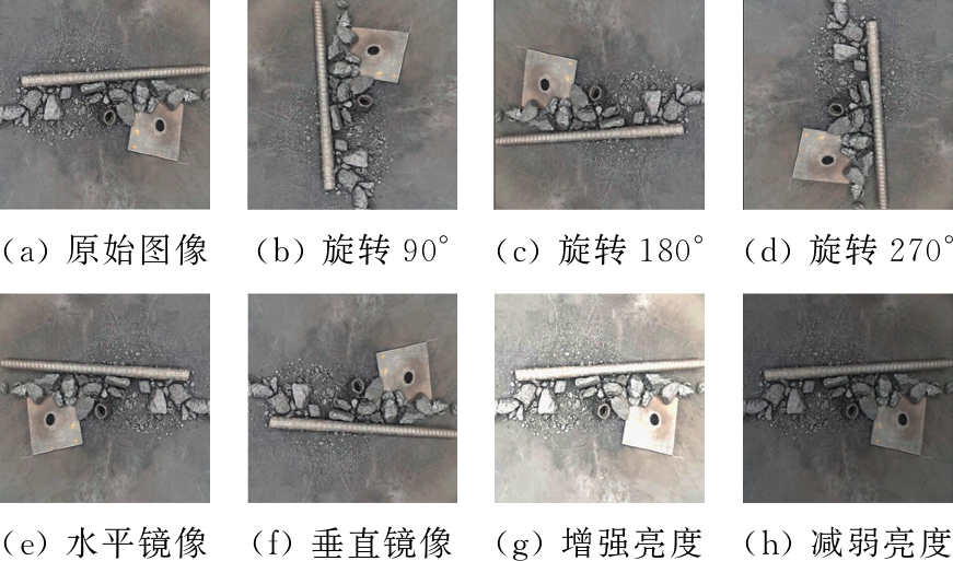 利用旋转、镜像、亮度调节等图像处理方法对异物数据集进行数据增强,以扩大数据集规模,加强数据集多样性,如图6所示。