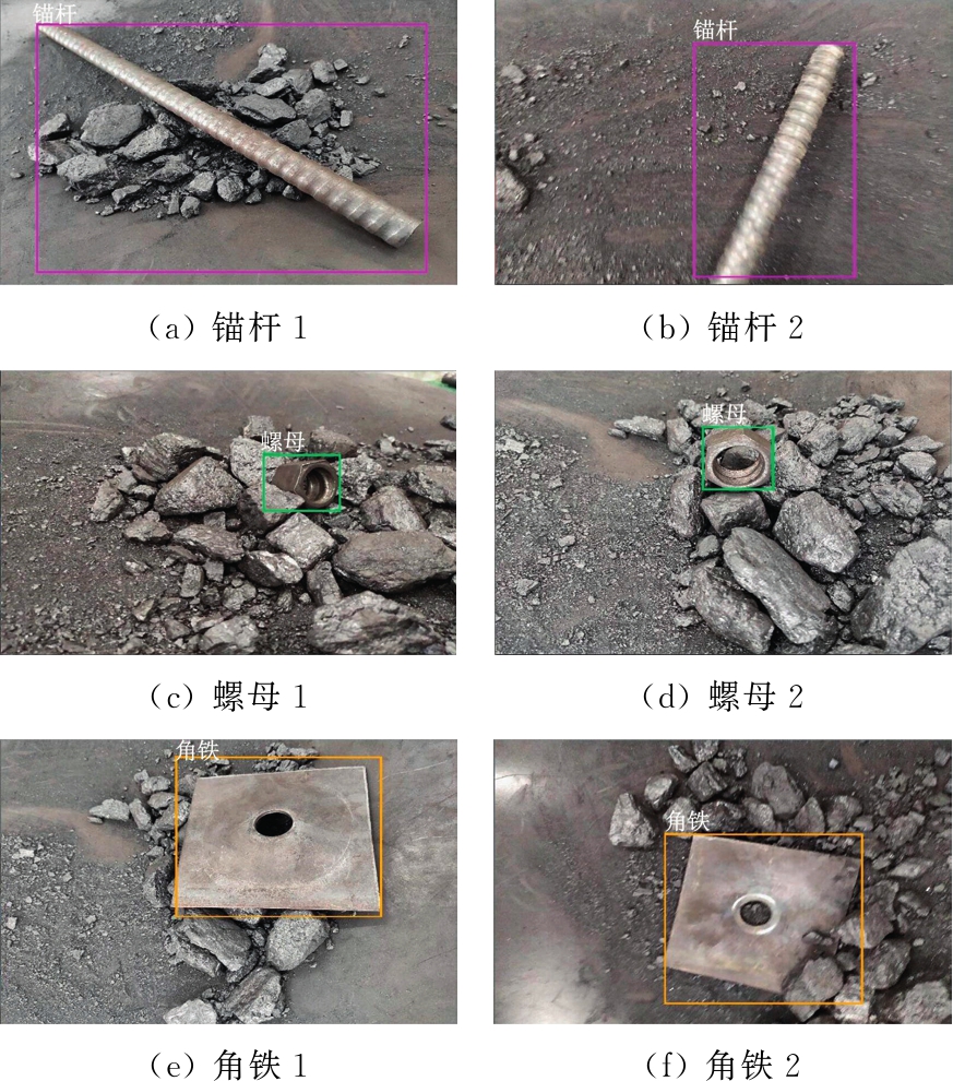 本文中所使用的异物数据均来自实验室模拟煤矿井下带式输送机图像,考虑到煤矿井下环境复杂,采集图像时用了不同光照强度,在胶带不同方位拍摄图像,并在后期增加噪声以模拟井下粉尘影响,部分训练样本如图4所示。整个数据集有6 034张异物图像,分辨率为2 592×1 944,包含了锚杆、角铁、螺母3种单目标样本和多目标样本4类。