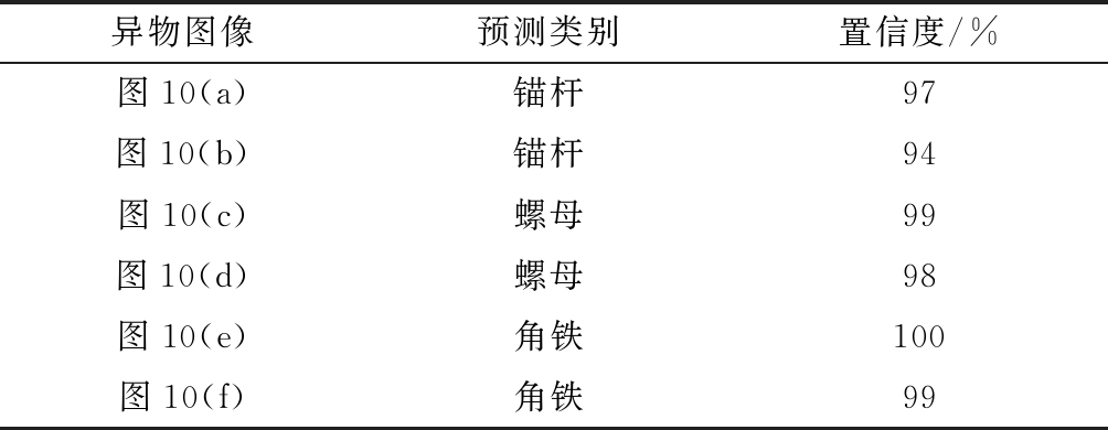 异物图像预测类别置信度/%图10(a)锚杆97图10(b)锚杆94图10(c)螺母99图10(d)螺母98图10(e)角铁100图10(f)角铁99