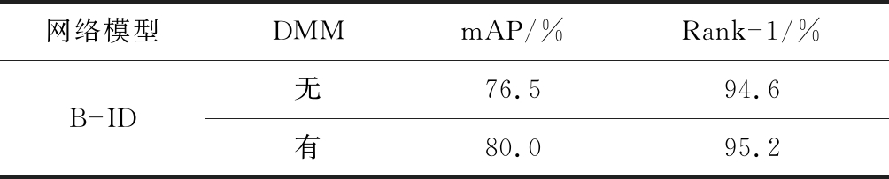为了验证DMM的有效性,在由骨干网络及ID-CM构成的网络(B-ID)上进行实验,结果见表2。可看出B-ID引入DMM(即DCAN)后,Rank-1达95.2%,mAP达80.0%,分别较无DMM时提高了0.6%,3.5%,说明添加DMM的网络能学习到更精确的人员特征,从而提高井下人员重识别的准确度。