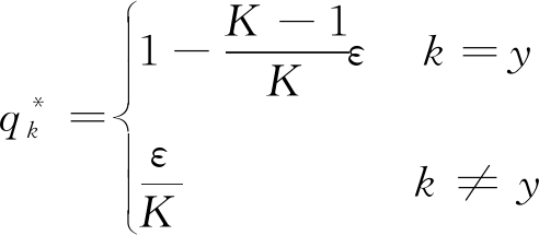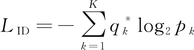 式中:p为人员ID预测概率,p=softmax(F);y为每个输入图像的实际ID,y∈{1,2,…,K},K为ID数量,即训练集中人员类别数;pk为人员图像属于第k类ID的预测概率;qk为人员图像属于第k类ID的真实概率,若预测ID与真实ID相同,则qk=1,否则qk=0。