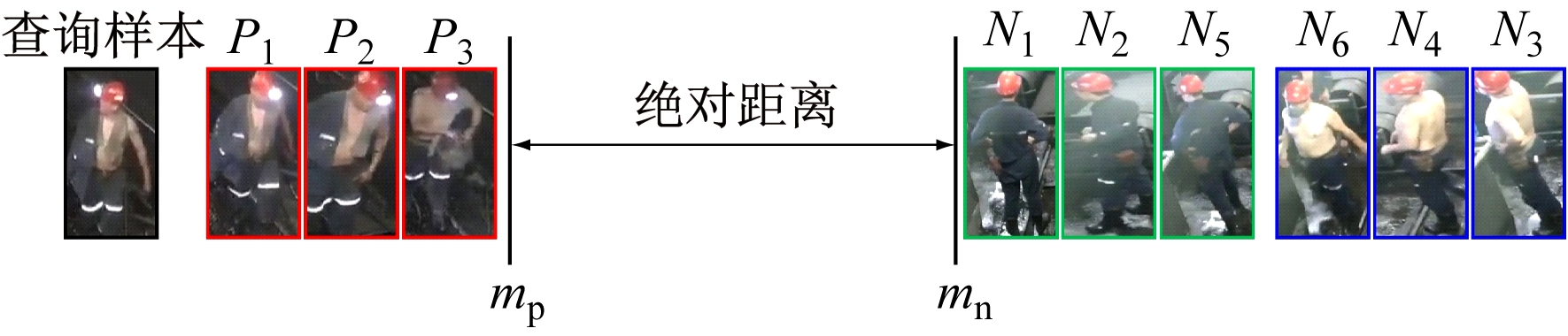 由于井下人员图像容易受到光照、遮挡、视角及相机分辨率的影响,仅依靠ID-CM对人员特征进行度量无法实现准确识别,导致在初始排序列表中存在负样本(如N1,N2,N3)排序靠前而正样本(如P2,P3)排序靠后的现象。因此,对每个查询样本,DMM先通过2个距离阈值——正样本阈值mp和负样本阈值mn来约束样本间的距离度量过程,其目标是将每个查询样本的正样本拉到mp以内且将负样本推到mn以外。