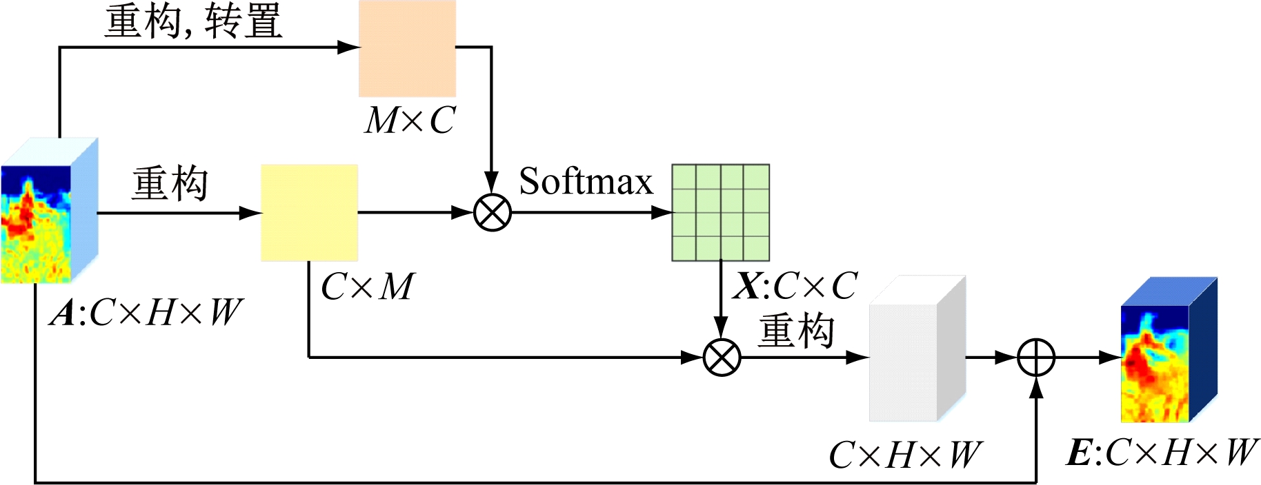 CAM结构如图3所示。对于Conv2层输出的特征图A∈RC×H×W(C为特征通道数,H为特征图高度,W为特征图宽度),首先进行降维操作以降低计算复杂度,得到大小为C×M(M=H×W)的通道特征矩阵;然后通过该通道特征矩阵计算各通道间的相关性,得到特征相关性矩阵X∈RC×C;最后根据各通道特征间的相关性进行重组再融合,得到具有丰富人员信息的特征图E∈RC×H×W。相关计算公式如下。