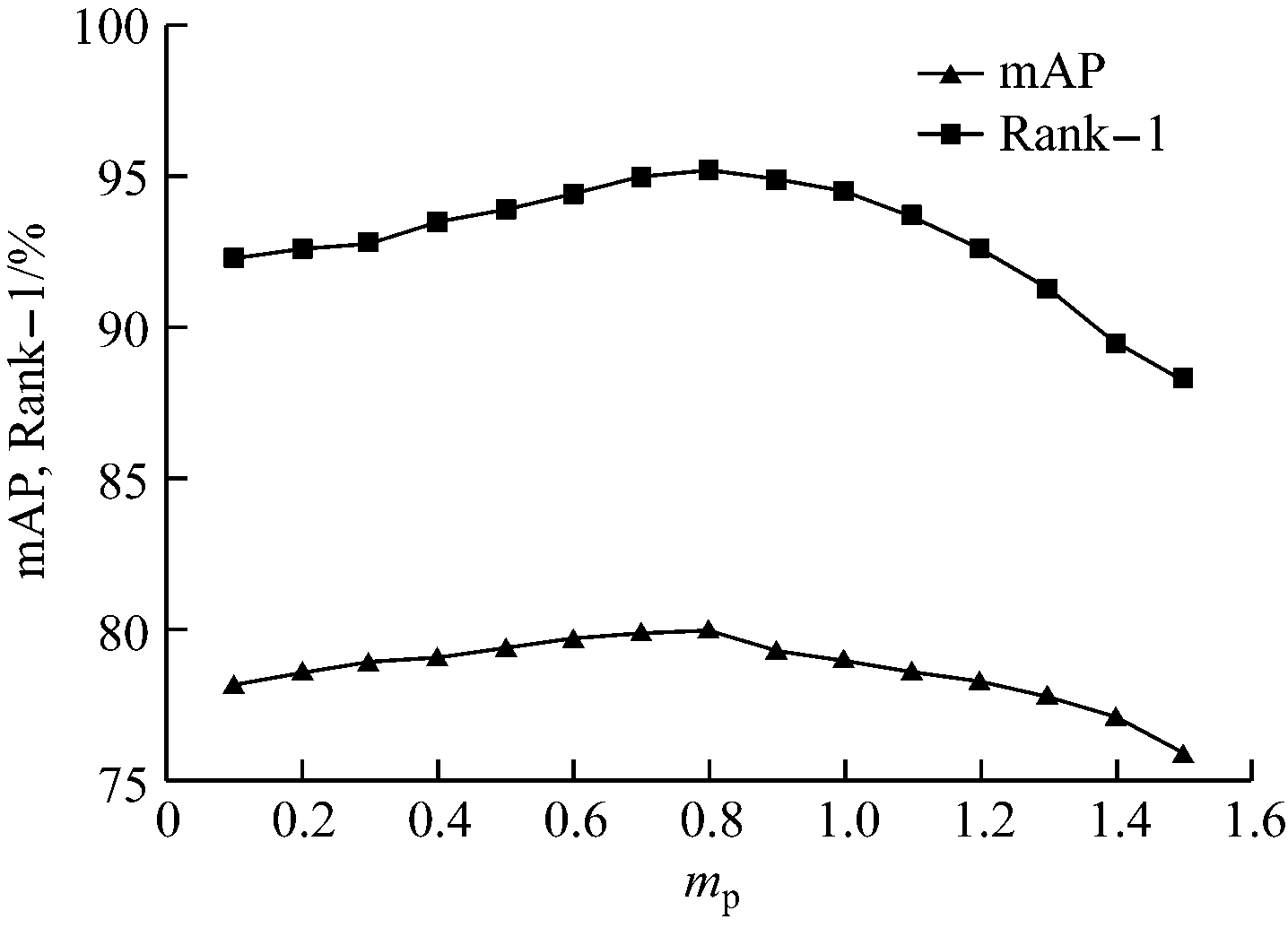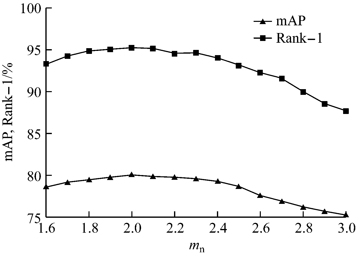 在前端特征提取的基础上,为了评估DMM中距离阈值mp和mn对网络性能的影响,分别固定mp和mn,在DCAN上进行实验,结果如图6所示。可看出在mn一定的情况下,mp=0.8时Rank-1和mAP均达到最优值;在mp一定的情况下,mn=2.0时Rank-1和mAP均达到最优值;mp>0.8,mn>2.0时,随着距离阈值增大,Rank-1和mAP均明显下降。可见距离阈值对提高网络判别能力具有重要意义。本文将mp和mn分别设置为0.8和2.0。