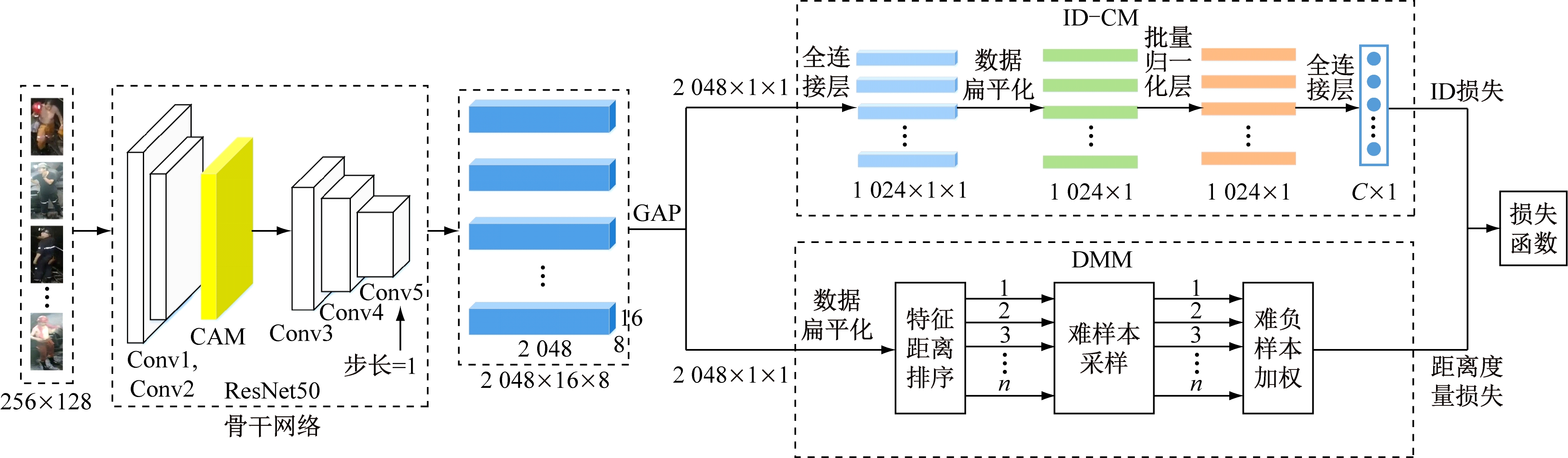 本文提出了一种基于通道注意力和距离度量的网络(Distance-metric Channel Attention Network,DCAN)结构,并将其应用于井下复杂环境人员重识别。该网络针对井下人员与背景不易区分的难点,引入通道注意力模块(Channel Attention Module,CAM)[10],在提高人员前景特征信息的同时抑制背景信息,并扩大网络输出特征图的尺寸,以获得更多的细粒度信息,丰富人员的判别特征,从而增强网络对特征的学习能力;在实现井下人员身份(Identity Document,ID)分类的基础上,利用图像特征间的绝对距离信息,通过距离度量模块(Distance Metric Module,DMM)对难识别图像进行采样和加权处理,增加难样本在反向传播时的权重,使其更加关注具有判别力的人员特征,提高井下人员重识别的准确度。