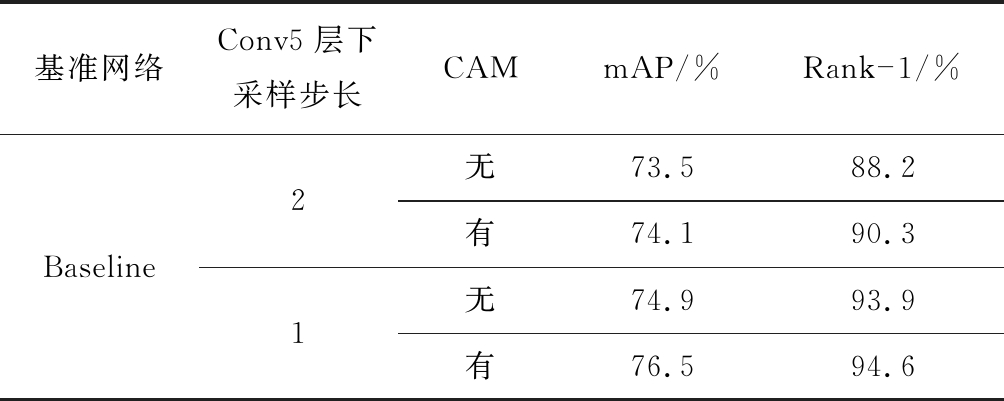 基准网络Conv5层下采样步长CAMmAP/%Rank-1/%Baseline21无73.588.2有74.190.3无74.993.9有76.594.6
