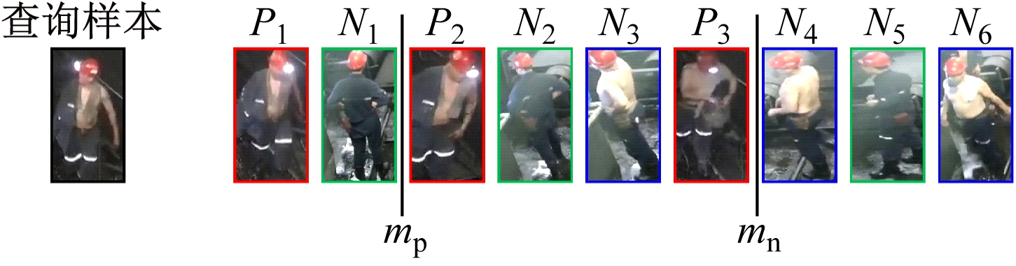 DMM训练批次排序列表如图5所示,其中人员图像代表每个批次选取的样本,除查询样本外,其余均为候选样本。在候选样本中,不同颜色代表不同类别的样本,且P1—P3为正样本(与查询样本类别相同),N1—N6为负样本(与查询样本类别不同)。