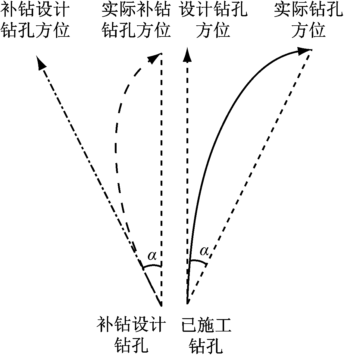 (4) 钻孔偏移规律分析。在回转钻进的施工过程中,为获取最佳的抽采效果,需要实钻轨迹尽可能与设计轨迹一致,然而由于钻孔轨迹易受岩层地质条件、煤层分布、钻杆自质量及钻进参数等多种因素的影响,实钻轨迹总是偏离设计轨迹。实钻轨迹与这些影响因素之间的定量化关系难以确定。如何根据已有的实钻轨迹与设计轨迹找到该钻场钻孔偏移的整体规律,在后续钻孔施工中根据偏移规律重新设计钻孔开孔倾角及方位角,使得钻孔在煤层中的实际轨迹与设计轨迹尽可能吻合或是实际轨迹的落点尽可能处于钻孔瓦斯抽采盲区内,从而达到控制与消除瓦斯抽采盲区的目的。