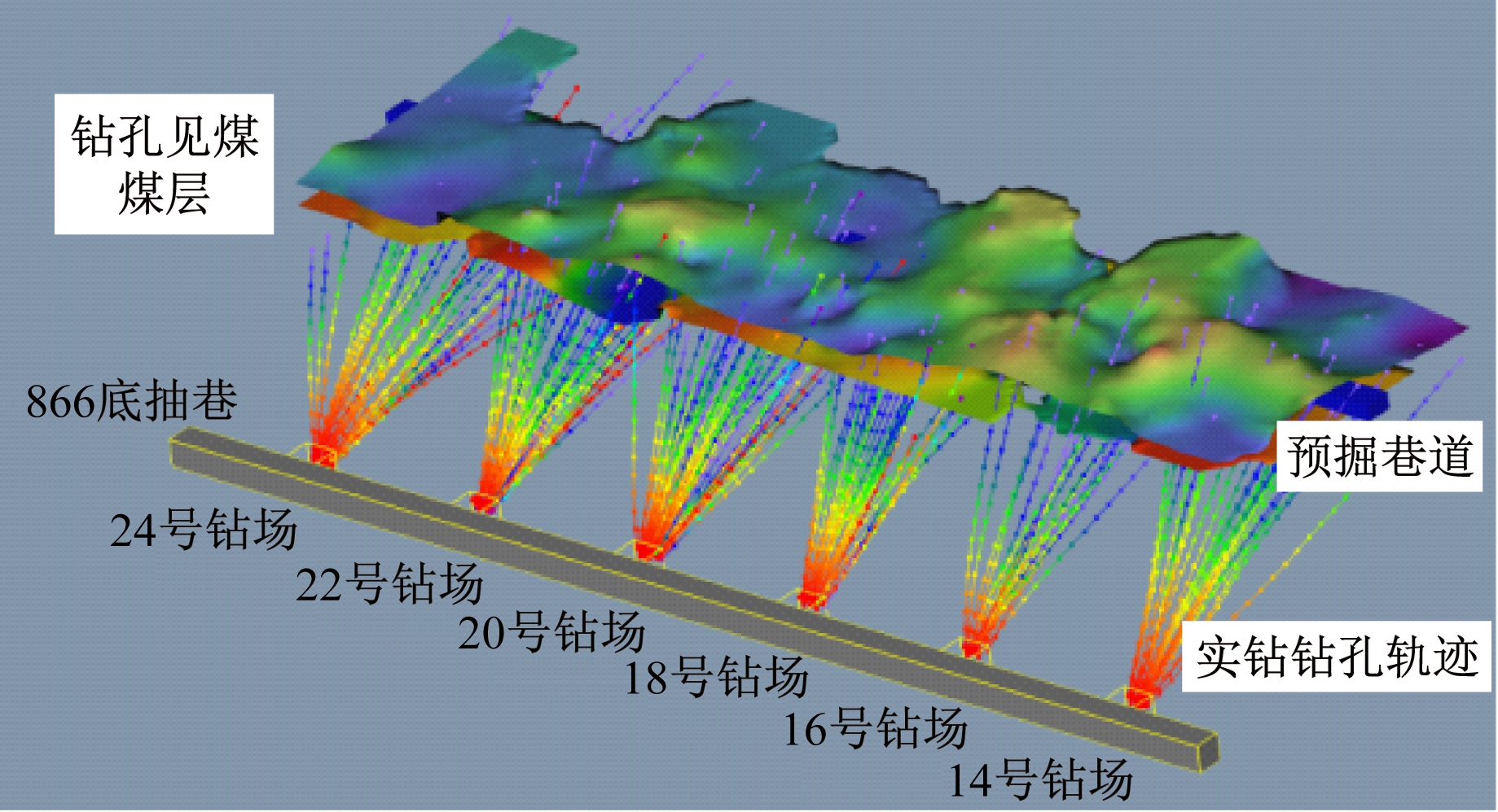 (2) 该软件解决了钻场或巷道钻孔群轨迹的三维显示问题,可直观再现钻孔轨迹与煤层的关系,为钻孔瓦斯抽采盲区的定量评价提供了一种新方法,能指导后续钻孔轨迹设计与施工工作,满足施工现场多层次的实际需求。