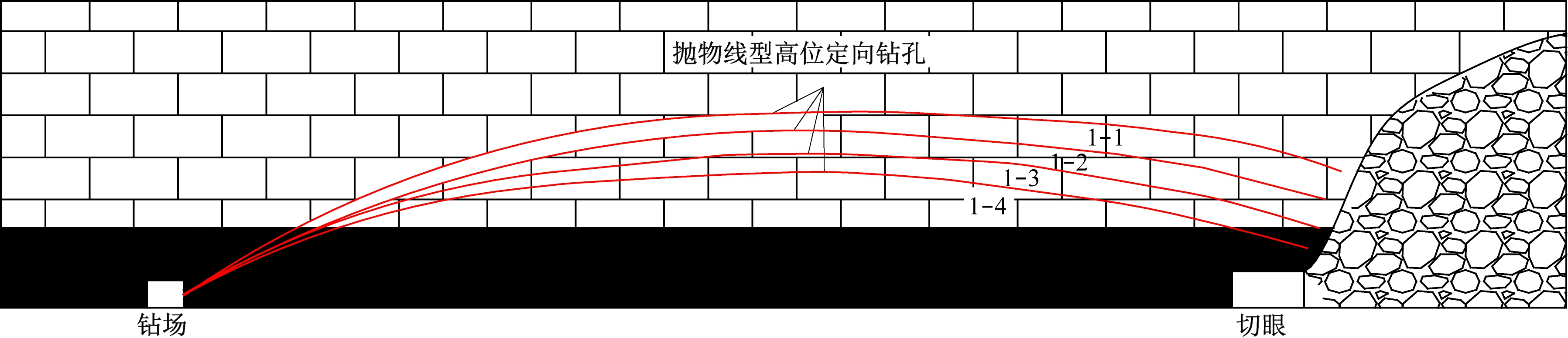 一般情况下,工作面初采期间基本顶初次来压前,采空区上覆岩层垮落高度较低,裂隙发育较少,上部裂隙带还未完全形成,瓦斯不能及时地浮生到裂隙带,若采用常规设计的高位定向水平钻孔(图7)抽采采空区瓦斯,由于覆岩的裂隙发育较少且层位较低,会导致采空区瓦斯抽采效果不佳。王家岭矿曾在多个工作面的初采期采用常规的高位定向水平钻孔抽采瓦斯,但抽采效果不理想,导致工作面的瓦斯浓度较高,因此,为了提高初采期高位定向钻孔的抽采效果,需要对高位定向钻孔的轨迹进行优化设计。