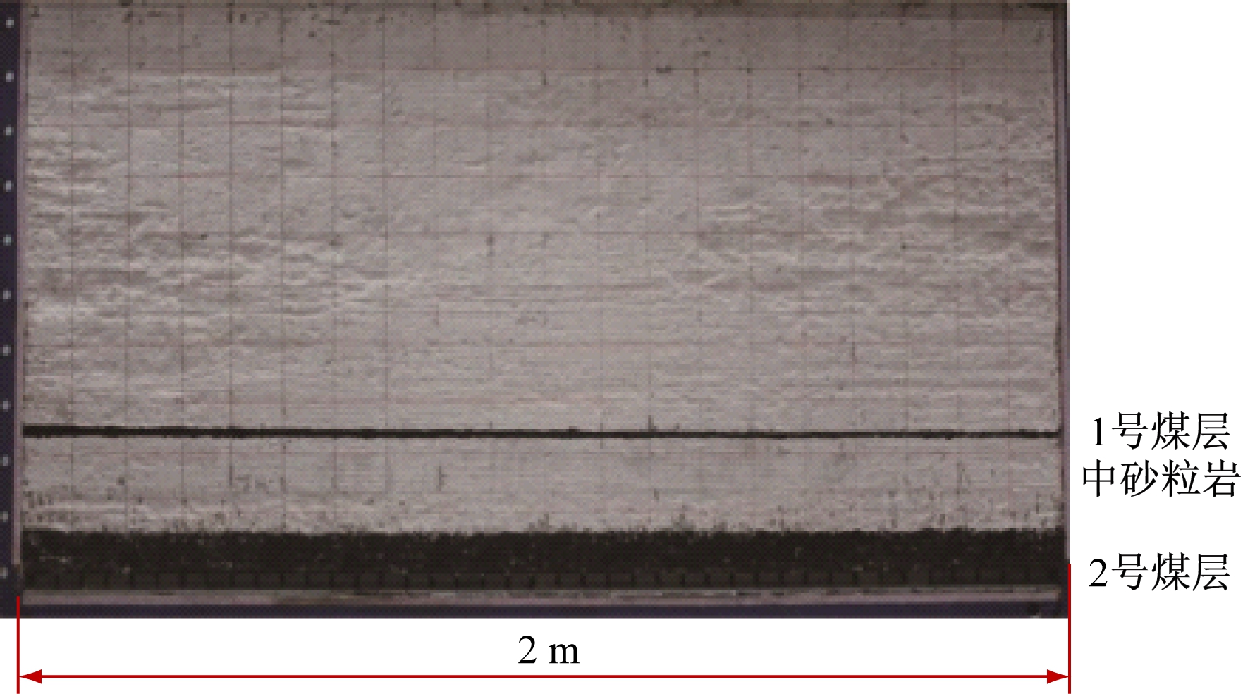 本次相似模拟实验的几何相似常数取值为100,密度相似取1.5,泊松比相似常数取值为1.0。根据王家岭矿实际地质条件、覆岩性质等各因素选择相似模拟材料的配比号(表1),构建2 m走向的物理相似模型,结合模型的大小,逐层计算各分层材料的用量并填充,工作面物理相似模型如图1所示。