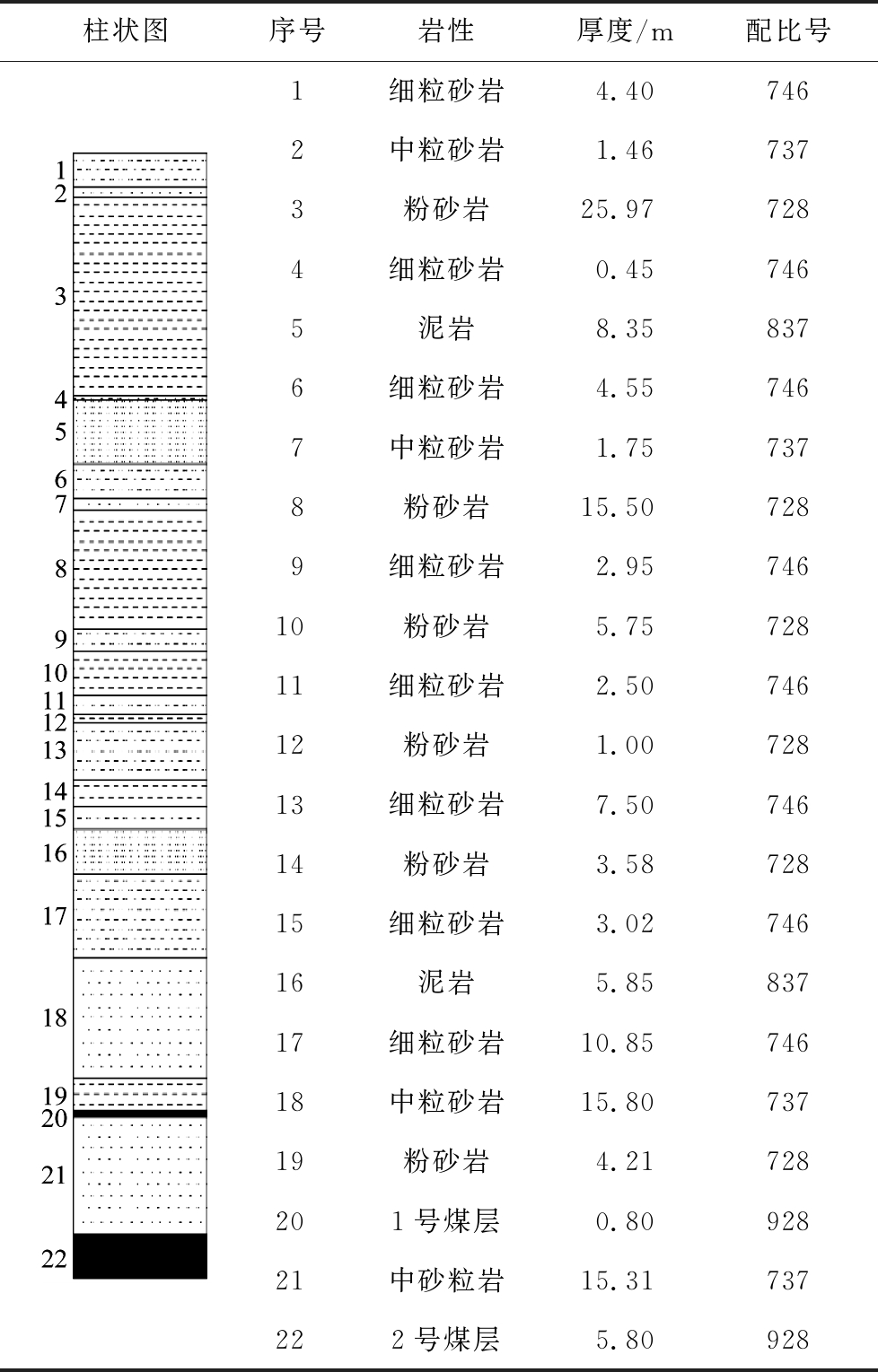 柱状图序号岩性厚度/m配比号1细粒砂岩4.407462中粒砂岩1.467373粉砂岩25.977284细粒砂岩0.457465泥岩8.358376细粒砂岩4.557467中粒砂岩1.757378粉砂岩15.507289细粒砂岩2.9574610粉砂岩5.7572811细粒砂岩2.5074612粉砂岩1.0072813细粒砂岩7.5074614粉砂岩3.5872815细粒砂岩3.0274616泥岩5.8583717细粒砂岩10.8574618中粒砂岩15.8073719粉砂岩4.21728201号煤层0.8092821中砂粒岩15.31737222号煤层5.80928