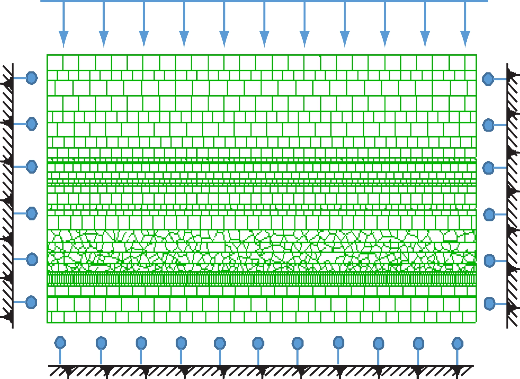 采用UDEC数值模拟软件,根据2号煤层顶板岩层物理力学性质(表2)设计走向为400 m、高度为200 m的模型,煤层开采高度为6 m,工作面推进速度为6 m/d,数值计算模型如图2所示。模型左右和底部边界位移固定,顶部施加5 MPa均布载荷模拟上覆岩层应力,覆岩采用弹塑性本构模型,屈服准则采用符合莫尔-库仑屈服准则。在模型左右各留50 m的边界影响区域,研究初采期工作面推进至50 m范围内的覆岩裂隙演化规律。
