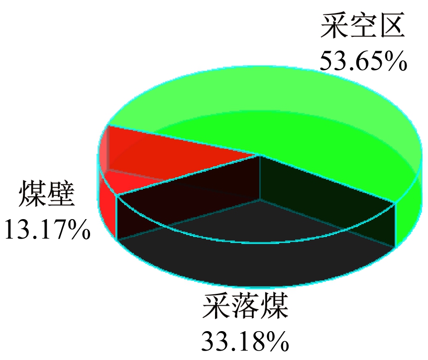 综放工作面的瓦斯按照来源的不同可以分为煤壁瓦斯涌出、采落煤瓦斯涌出以及采空区瓦斯涌出。采用现场实测瓦斯浓度和报表统计法得出了工作面的瓦斯来源及构成,如图5所示。初采期,采落煤释放的瓦斯一部分随着风流排出,另一部分被漏风带入采空区,加之初采期煤层顶板覆岩裂隙发育不充分,采空区遗煤释放的瓦斯和采落煤漏入采空区的瓦斯大量积存到采空区中,采空区瓦斯涌出量占工作面瓦斯涌出量的50%以上。因此,在初采期,采空区的瓦斯涌出是工作面瓦斯涌出的主要来源,需采取高位钻孔对采空区的瓦斯进行抽采,防止采空区顶板来压时工作面瓦斯浓度升高或者超限。