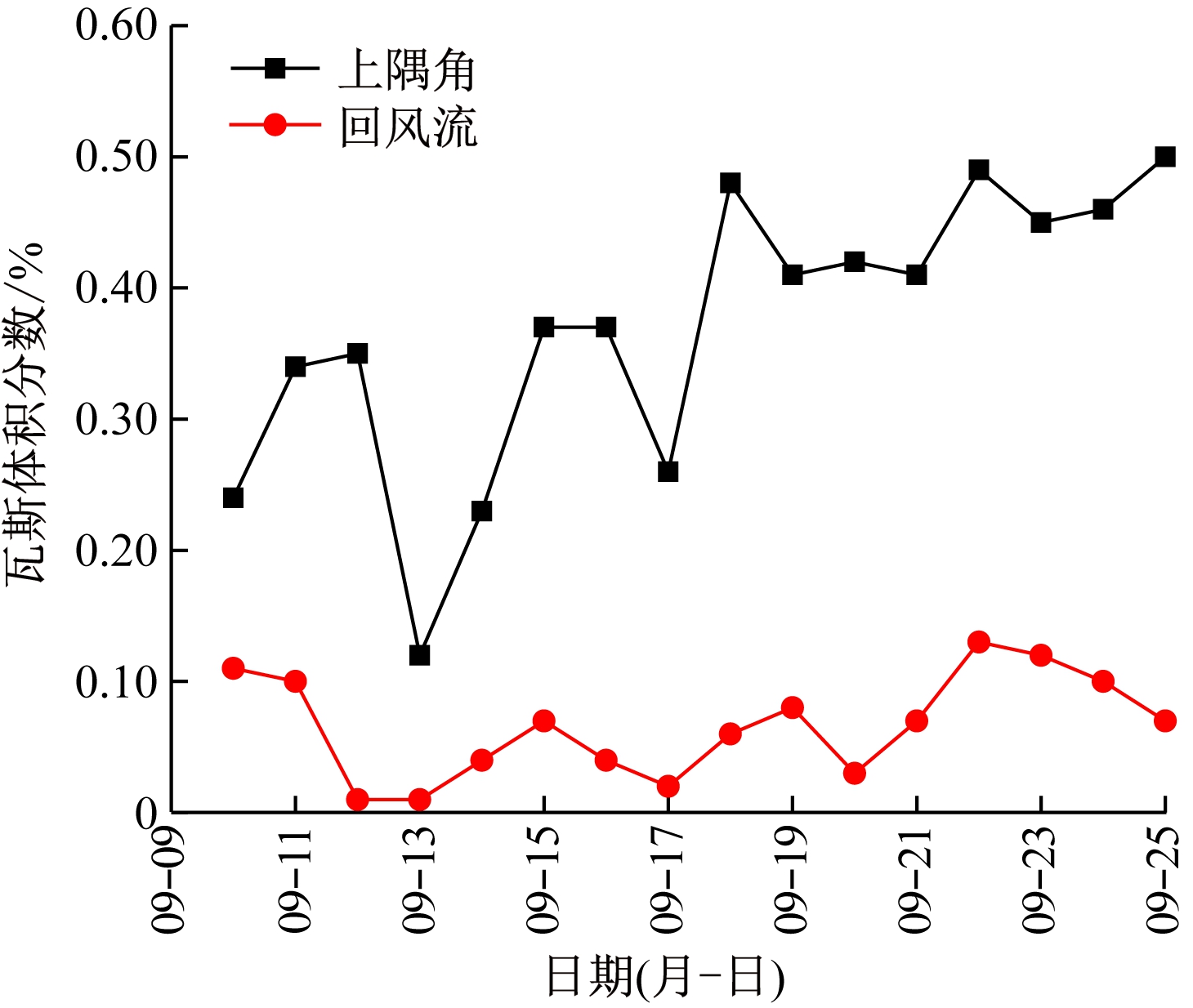 初采期高位钻孔抽采下的工作面上隅角和回风流最大瓦斯体积分数如图11所示。从图11可看出,利用抛物线型高位定向钻孔抽采采空区瓦斯,采空区瓦斯能被及时抽出,防止了瓦斯涌出到工作面,初采期间上隅角最大瓦斯体积分数为0.12%~0.50%,平均瓦斯体积分数为0.36%,回风流最大瓦斯体积分数为0.01%~0.13%,平均瓦斯体积分数为0.06%,瓦斯体积分数均小于0.80%,达到了工作面瓦斯治理的预期效果,工作面能够安全高效生产。因此,工作面初采期利用抛物线型高位定向钻孔抽采瓦斯,在保障工作面的安全回采中起到了至关重要的作用。