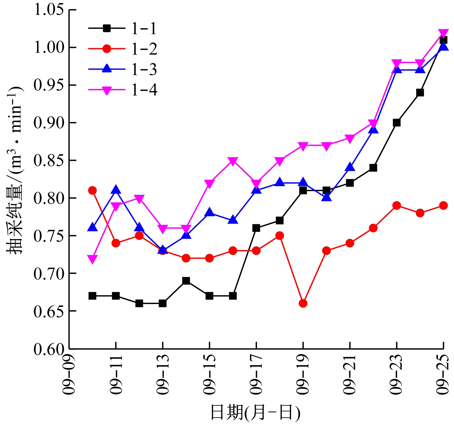 (3) 为了优化初采期高位钻孔的抽采效果,结合初采期覆岩裂隙演化规律,对初采期的高位定向钻孔的轨迹进行了优化设计。将工作面初采期的高位水平长钻孔设计成抛物线轨迹,该钻孔轨迹将钻孔终孔位置设计在煤层里,能够和采空区直接导通,用于工作面初采期采空区低位瓦斯抽采,解决了高位水平钻孔初采期层位较高的问题,避免了工作面基本顶初次来压时采空区瓦斯短时间内排出造成的上隅角瓦斯浓度偏高的问题。