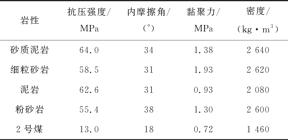 岩性抗压强度/MPa内摩擦角/(°)黏聚力/MPa密度/(kg·m3)砂质泥岩64.0341.382 640细粒砂岩58.5311.932 620泥岩62.6310.932 080粉砂岩55.4381.302 6002号煤13.0180.721 460