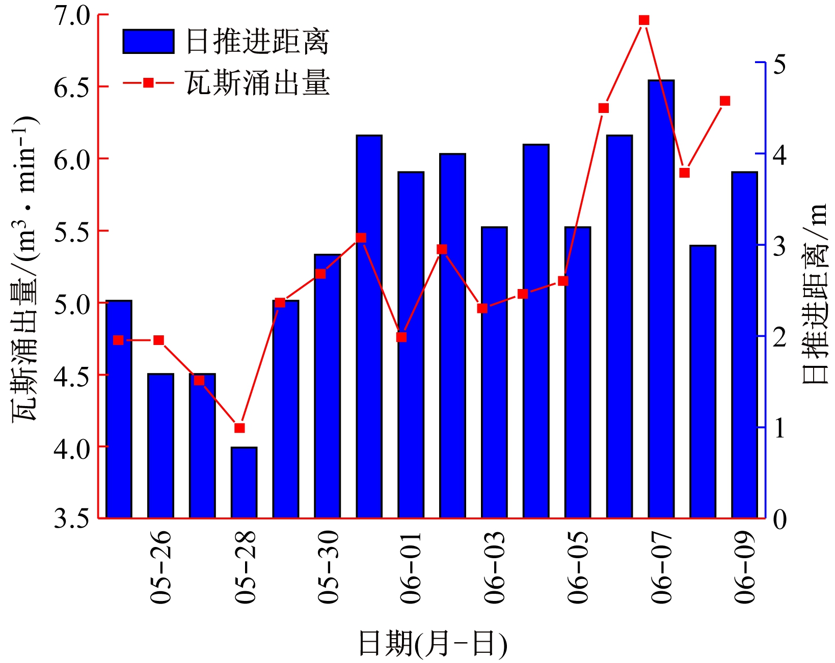 初采期工作面瓦斯涌出量如图6所示。从图6可看出,在初采期,工作面瓦斯涌出量整体上呈上升的趋势,且有明显的阶段性特征,大致可分为3个阶段:直接顶垮落前、直接顶垮落至基本顶初次垮落、基本顶垮落后。直接顶垮落前,工作面瓦斯涌出量不超过5 m3/min;随着工作面的推进,直接顶逐渐垮落,造成工作面瓦斯涌出量增大,在05-31达到5.45 m3/min,之后维持在5 m3/min左右;06-05由于基本顶的垮落,瓦斯涌出量大幅度增加,最大瓦斯涌出量接近7 m3/min。