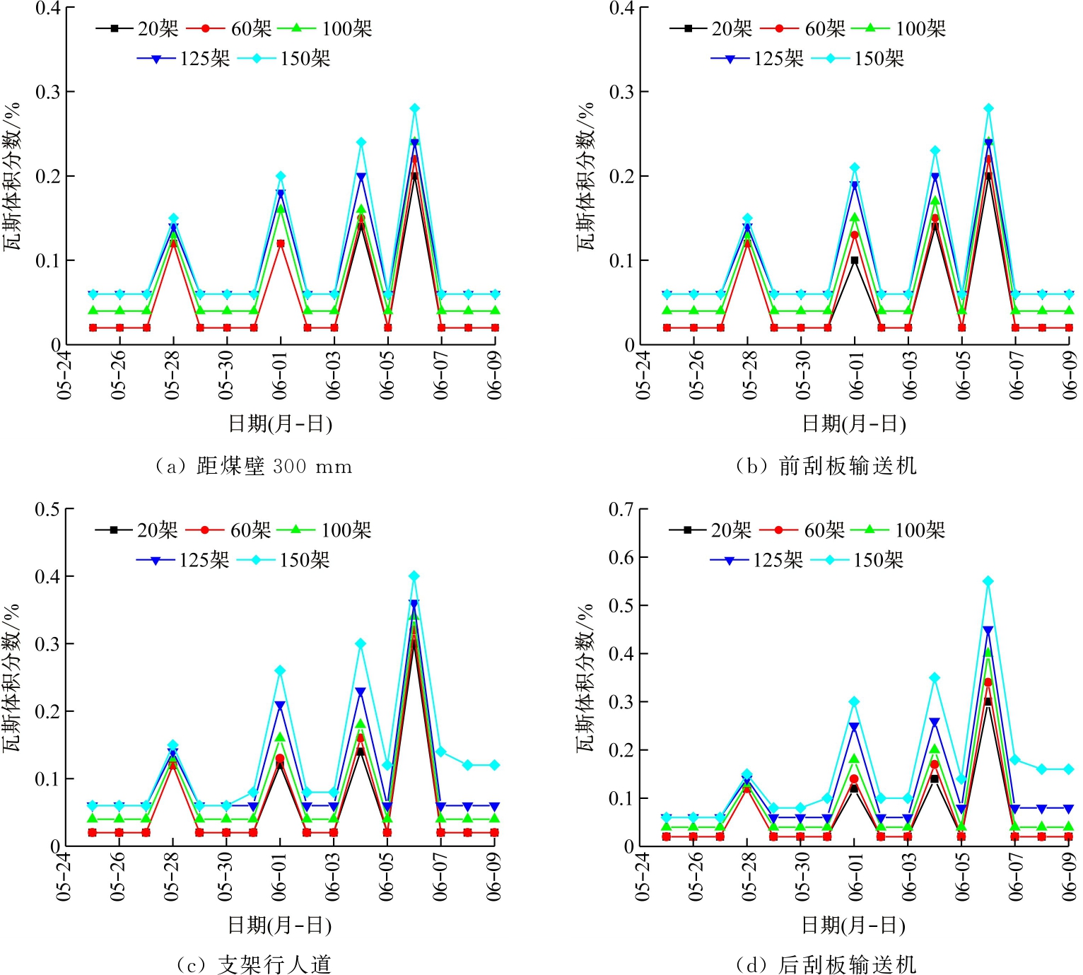 由图4可知,检修期间,不同日期和不同支架处的瓦斯体积分数差别不大,瓦斯体积分数为0.02%~0.12%,工作面暴露煤体自然释放瓦斯量最大仅为1.2 m3/min,分析认为此时涌出量即为工作面在检修时暴露煤体的瓦斯涌出量。05-28之前,生产班与检修班工作面不同位置处的瓦斯浓度变化很小,这是由于在初采阶段采空区范围较小,漏风迅速,将采空区瓦斯排出;05-28—06-06,生产班的瓦斯体积分数逐渐增大,沿工作面倾向,同一日期生产班的不同支架处瓦斯体积分数不同,但瓦斯体积分数变化规律相似,工作面瓦斯体积分数从20~150架支架逐渐增大,且在100~150架支架处瓦斯体积分数的增幅较大,沿工作面走向,由工作面煤壁300 mm→前刮板输送机→支架行人道→后刮板输送机瓦斯体积分数逐渐增大,后刮板输送机的最大瓦斯体积分数接近0.6%,这是由于随着采空区面积的增大,采空区内存在大量瓦斯,漏风风流将采空区积存的瓦斯由100~150架支架的尾部排出,导致工作面的瓦斯体积分数较大。因此,在初采期间,需要设计参数合理的瓦斯抽采钻孔,对采空区的瓦斯进行抽采。