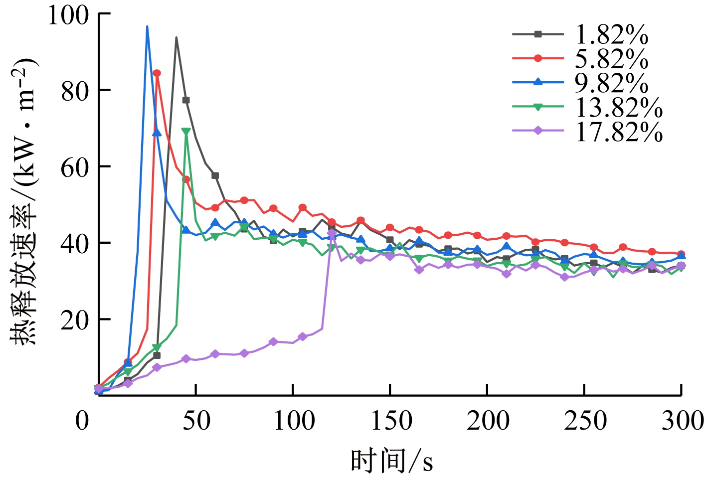 热释放速率是指在一定的热辐射强度下,单位面积煤样燃烧所释放热量的速率,其峰值可表征煤燃烧时的最大热释放程度[13]。不同含水率煤样热释放速率如图2所示。可看出不同含水率煤样热释放速率变化趋势基本相似,经短暂波动后迅速达到峰值再逐渐下降,最终趋于稳定;煤样热释放速率峰值随含水率增大先减小后增大再减小,煤样热释放速率峰值从大到小对应的含水率排序为9.82%>1.82%>5.82%>13.82%>17.82%;当含水率大于9.82%时,煤样水分含量越高,热释放速率峰值越小且下降越明显;1.82%,5.82%,9.82%,13.82%,17.82%含水率的煤样热释放速率达到峰值的时间分别为40,30,25,45,130 s,煤样在点燃的瞬间其热释放速率达到峰值,其中含水率17.82%的煤样热释放速率达到峰值的时间较长。