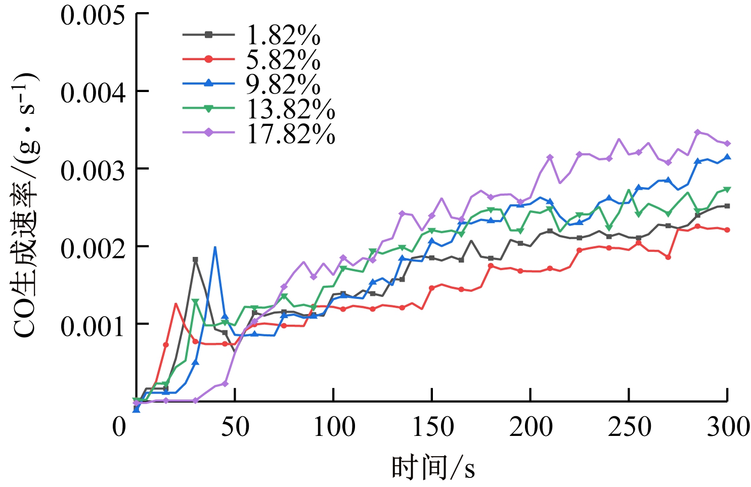 不同含水率煤样CO生成速率如图6所示。可看出不同含水率煤样CO生成速率呈先急剧增大后减小再缓慢增大的趋势;在燃烧初期,CO生成速率峰值从大到小对应的含水率排序为9.82%>1.82%>13.82%>5.82%>17.82%;在燃烧后期,含水率17.82%的煤样CO生成速率远高于其余煤样,含水率5.82%的煤样CO生成速率最低,这是由于含水率17.82%的煤样主要进行燃烧反应,含水率5.82%的煤样主要进行气化反应,而燃烧反应产生CO较多。