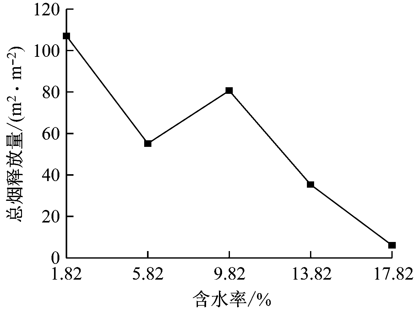 不同含水率煤样总烟释放量如图5所示。可看出煤样总烟释放量随含水率增大先减小后增大再减小,煤样总烟释放量从大到小对应的含水率排序为1.82%>9.82%>5.82%>13.82%>17.82%;当含水率大于9.82%时,煤样水分含量越高,总烟释放量越低。