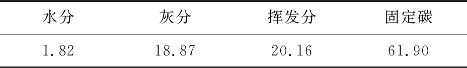 实验煤样取自中安联合煤化有限责任公司朱集西煤矿11502综采工作面,煤种为中等变质程度的烟煤,其工业分析结果见表1。将剥去氧化层的新鲜煤块用研磨机和筛煤机在N2气氛中进行破碎并筛分出粒径为0.10~0.15,0.15~0.20,0.20~0.30 mm的煤样,密封保存。选取3种不同粒径煤样各20 g,制成5组(每组60 g)混合煤样,将混合煤样在真空干燥箱内干燥24 h后,用透明喷壶均匀喷洒蒸馏水到煤样中,添加水分后的煤样放入密封袋中抽掉空气,放置在阴冷环境中7 d,使得煤体孔隙和裂隙中充分浸入水分,制成含水率分别为5.82%,9.82%,13.82%,17.82%的煤样。