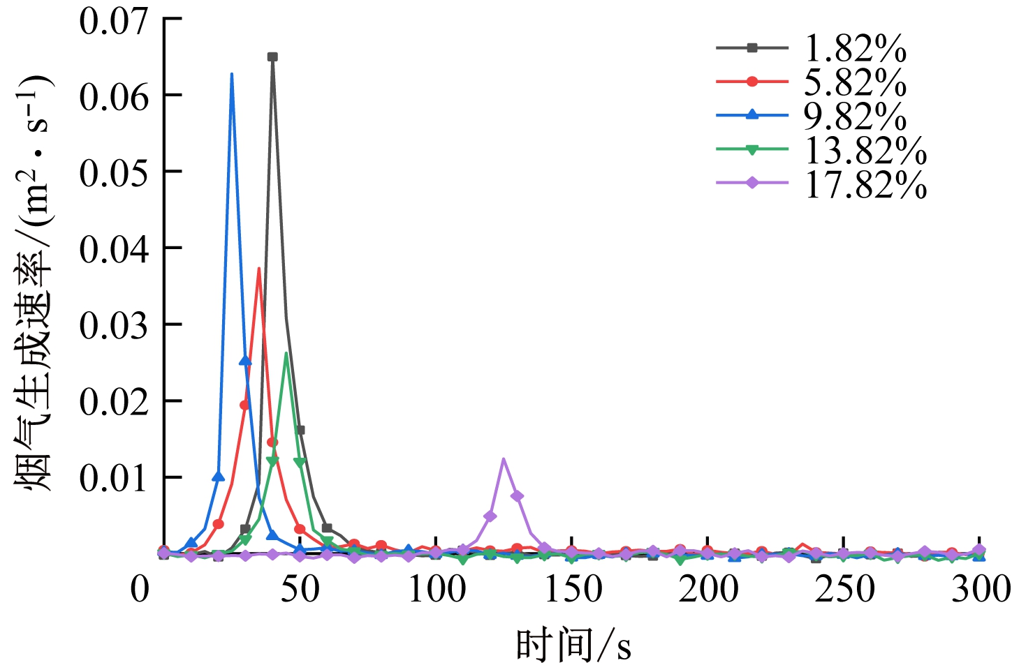 不同含水率煤样烟气生成速率如图4所示。可看出不同含水率煤样烟气生成速率变化趋势和热释放速率变化趋势基本一致,即经短暂波动后迅速达到峰值再下降并最终趋于平稳;烟气生成速率在热解阶段与红热阶段几乎为零,这是由于煤样在加热过程中随着温度升高,煤中的自由水、结合水及其气态挥发物质逐渐逸出,煤样从无焰燃烧转换为有焰燃烧,生成透光产物,不透光烟释放速率降低至零;煤样烟气生成速率峰值从大到小对应的含水率排序为1.82%>9.82%>5.82%>13.82%>17.82%。