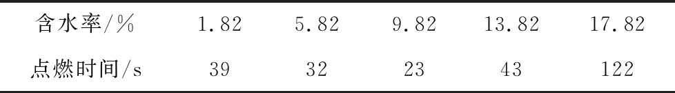 点燃时间是指煤样从暴露于热辐射源开始到表面出现明火为止的时间,反映煤样被点燃的容易程度,点燃时间越短,表明煤样越容易燃烧[11-12]。不同含水率煤样点燃时间见表2,可看出煤样点燃时间随着含水率增大先减少后增加,煤样点燃时间从长到短对应的含水率排序为17.82%>13.82%>1.82%>5.82%>9.82%。