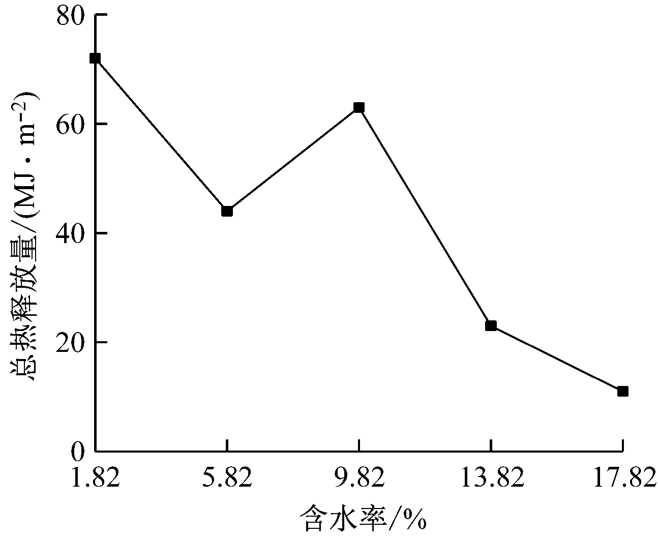 总热释放量是指煤样从点燃到熄灭时间内放出的总热量[14]。不同含水率煤样总热释放量如图3所示。可看出煤样总热释放量随含水率增大先减小后增大再减小,煤样总热释放量从大到小对应的含水率排序为1.82%>9.82%>5.82%>13.82%>17.82%;当含水率大于9.82%时,煤样水分含量越高,总热释放量越低。